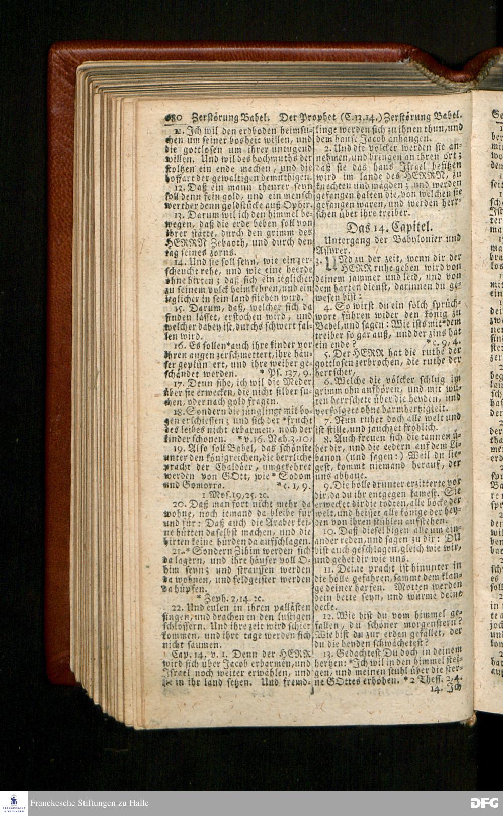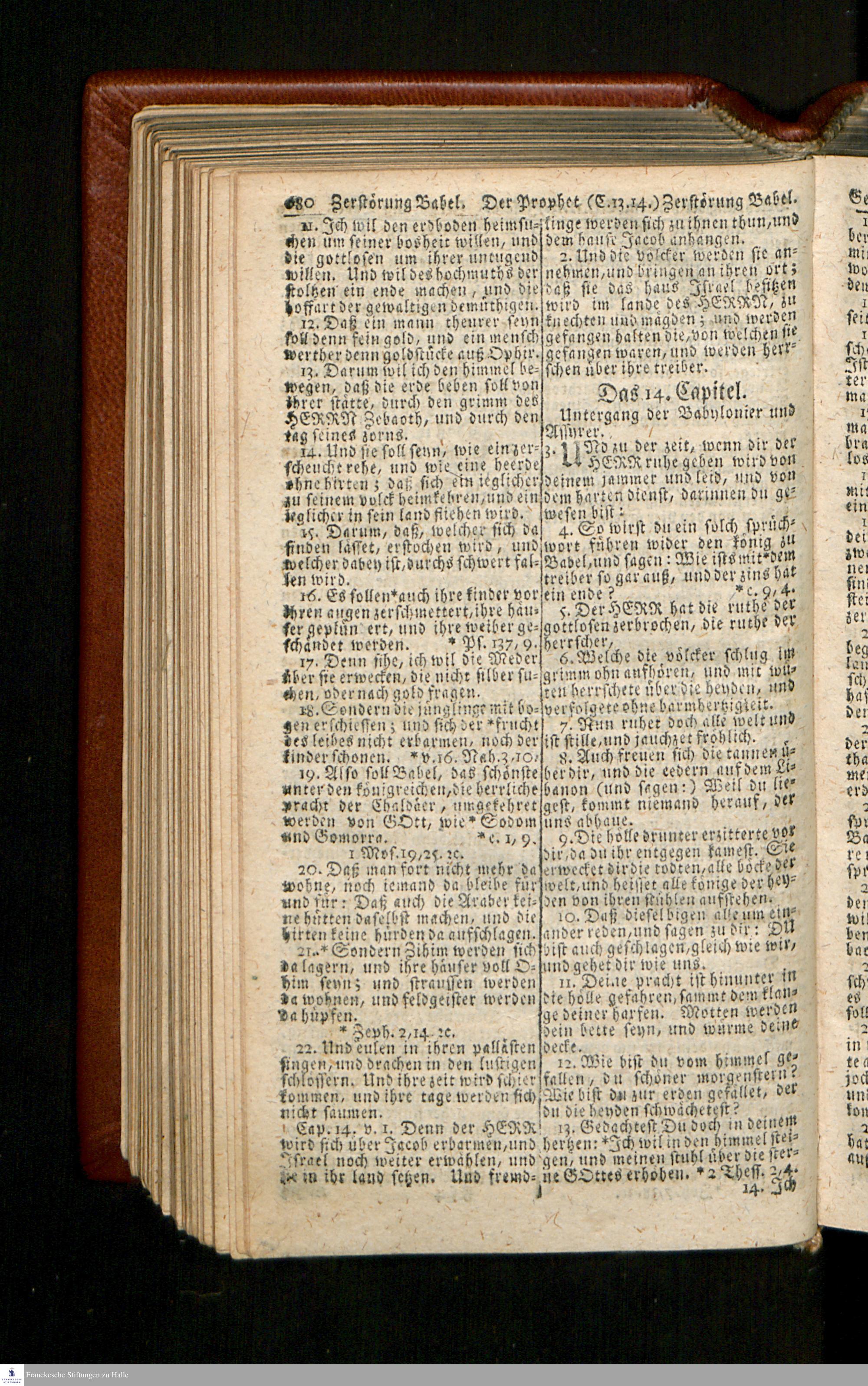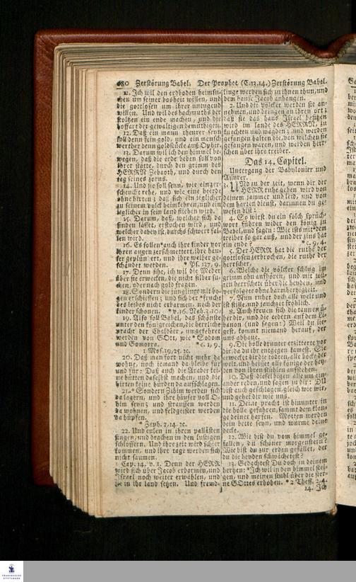 Biblia, Das ist: Die gantze Heil. Schrift Altes und Neues Testaments / Nach der Teutschen Ubersetzung D. Martin Luthers; Mit iedes Capitels kurtzen Summarien/ und nöthigsten Parallelen; Mit Fleiß übersehen, Und gegen einige/ sonderlich erstere/ Editiones des sel. Mannes gehalten, auch an unterschiedlichen Orten nach denselben eingerichtet, und von vielen in den bisherigen Exemplarien hin und wieder eingeschlichenen druckfehlern gesaubert. Nebst einer Vorrede Hn. Baron Carl Hildebrands v. Canstein.