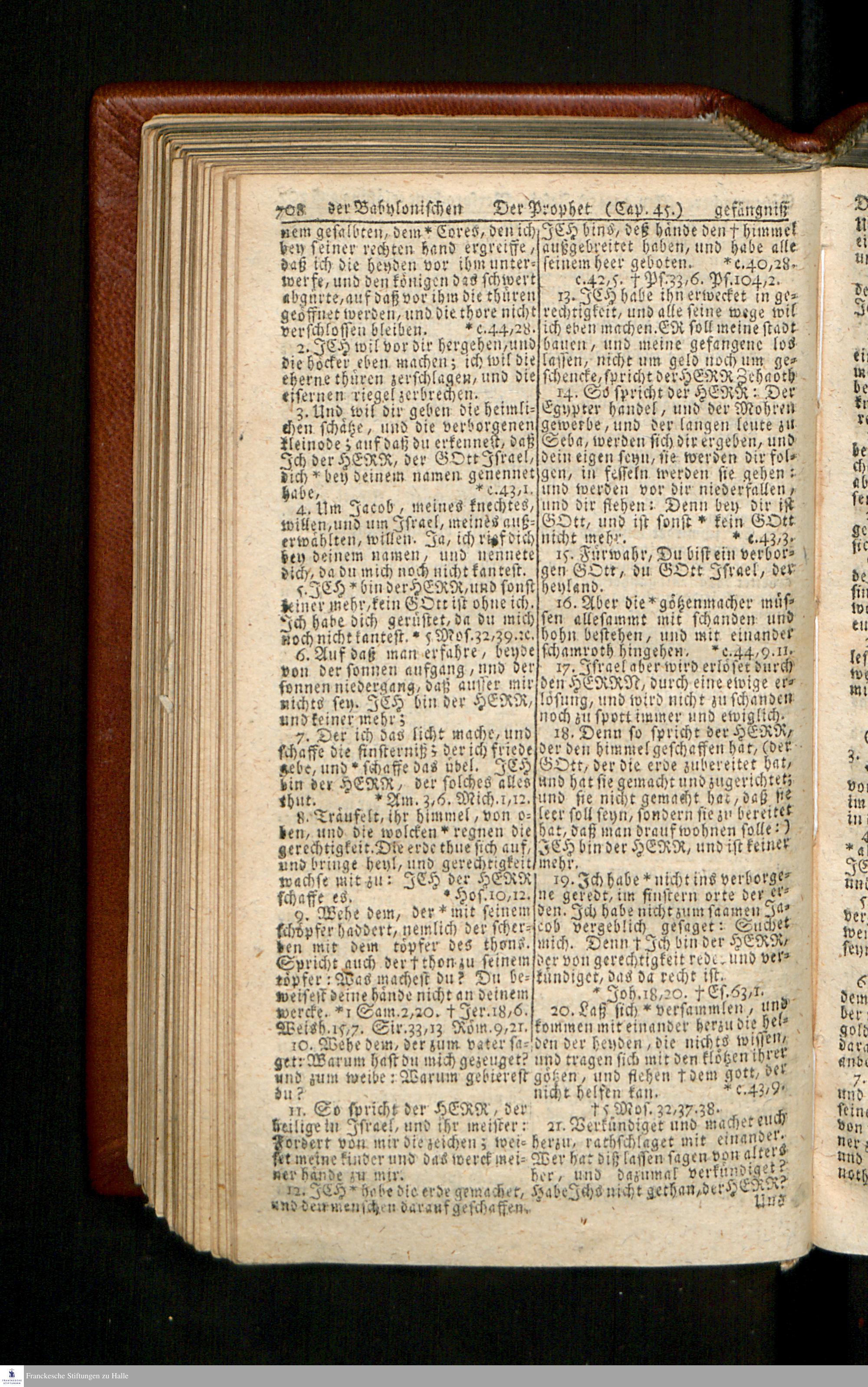 Biblia, Das ist: Die gantze Heil. Schrift Altes und Neues Testaments / Nach der Teutschen Ubersetzung D. Martin Luthers; Mit iedes Capitels kurtzen Summarien/ und nöthigsten Parallelen; Mit Fleiß übersehen, Und gegen einige/ sonderlich erstere/ Editiones des sel. Mannes gehalten, auch an unterschiedlichen Orten nach denselben eingerichtet, und von vielen in den bisherigen Exemplarien hin und wieder eingeschlichenen druckfehlern gesaubert. Nebst einer Vorrede Hn. Baron Carl Hildebrands v. Canstein.