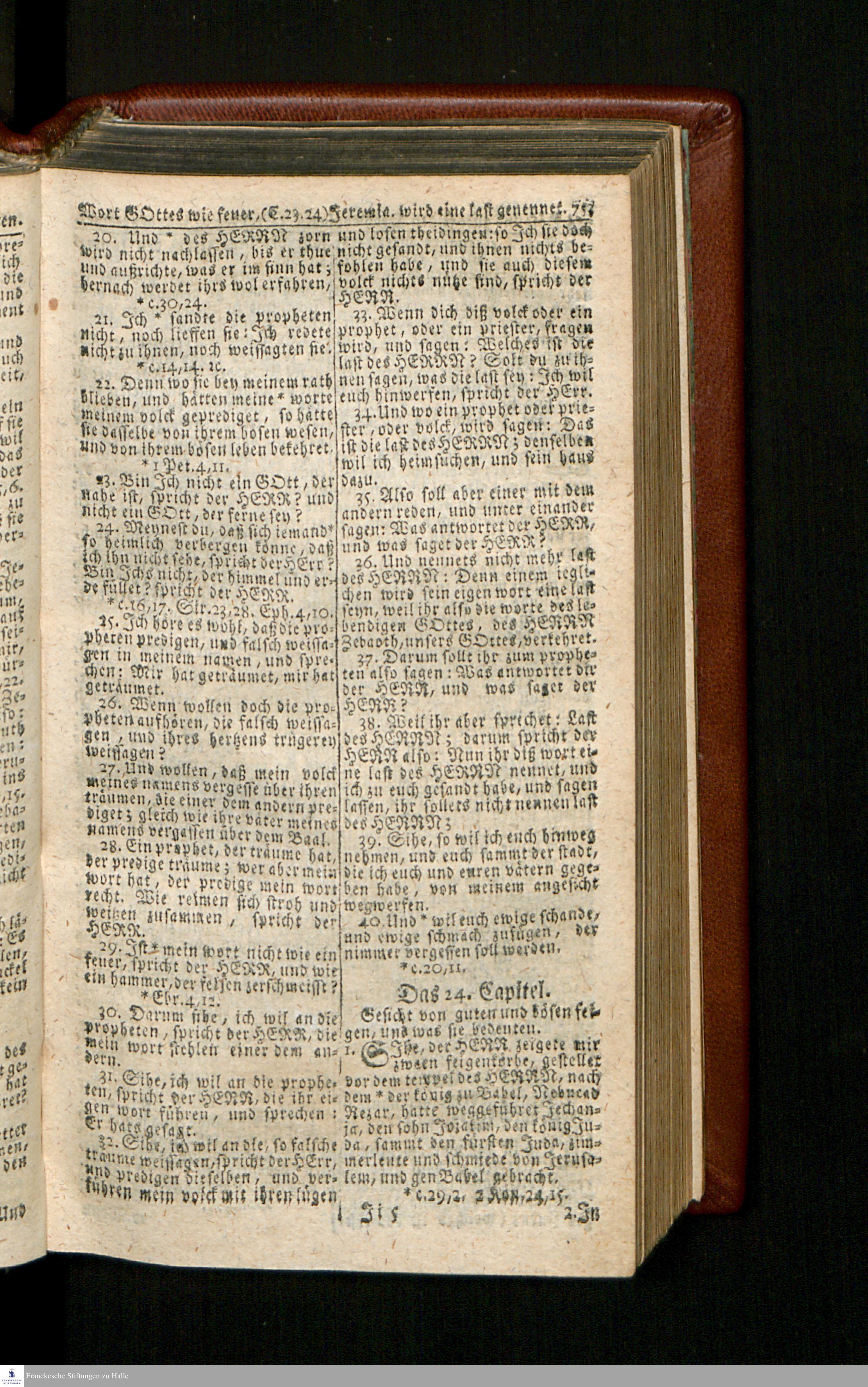 Biblia, Das ist: Die gantze Heil. Schrift Altes und Neues Testaments / Nach der Teutschen Ubersetzung D. Martin Luthers; Mit iedes Capitels kurtzen Summarien/ und nöthigsten Parallelen; Mit Fleiß übersehen, Und gegen einige/ sonderlich erstere/ Editiones des sel. Mannes gehalten, auch an unterschiedlichen Orten nach denselben eingerichtet, und von vielen in den bisherigen Exemplarien hin und wieder eingeschlichenen druckfehlern gesaubert. Nebst einer Vorrede Hn. Baron Carl Hildebrands v. Canstein.