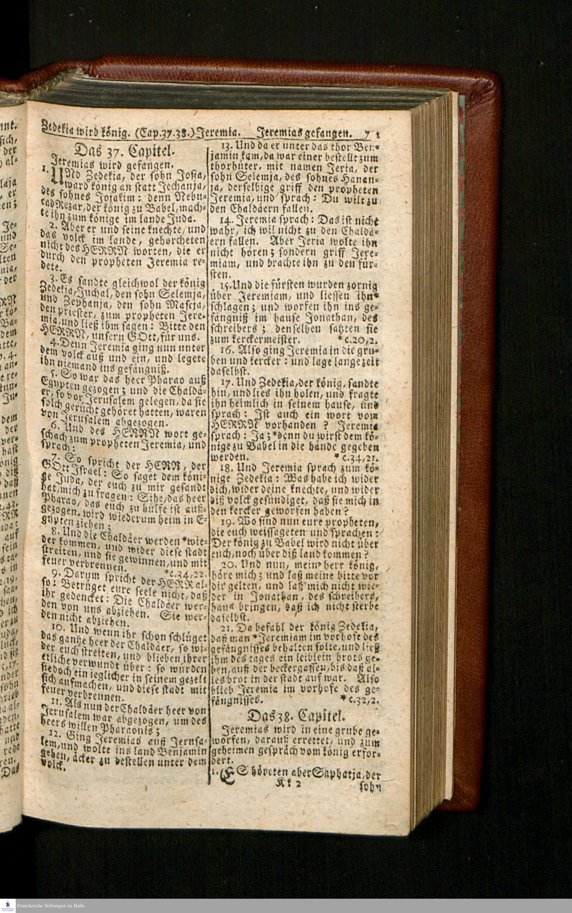 Biblia, Das ist: Die gantze Heil. Schrift Altes und Neues Testaments / Nach der Teutschen Ubersetzung D. Martin Luthers; Mit iedes Capitels kurtzen Summarien/ und nöthigsten Parallelen; Mit Fleiß übersehen, Und gegen einige/ sonderlich erstere/ Editiones des sel. Mannes gehalten, auch an unterschiedlichen Orten nach denselben eingerichtet, und von vielen in den bisherigen Exemplarien hin und wieder eingeschlichenen druckfehlern gesaubert. Nebst einer Vorrede Hn. Baron Carl Hildebrands v. Canstein.