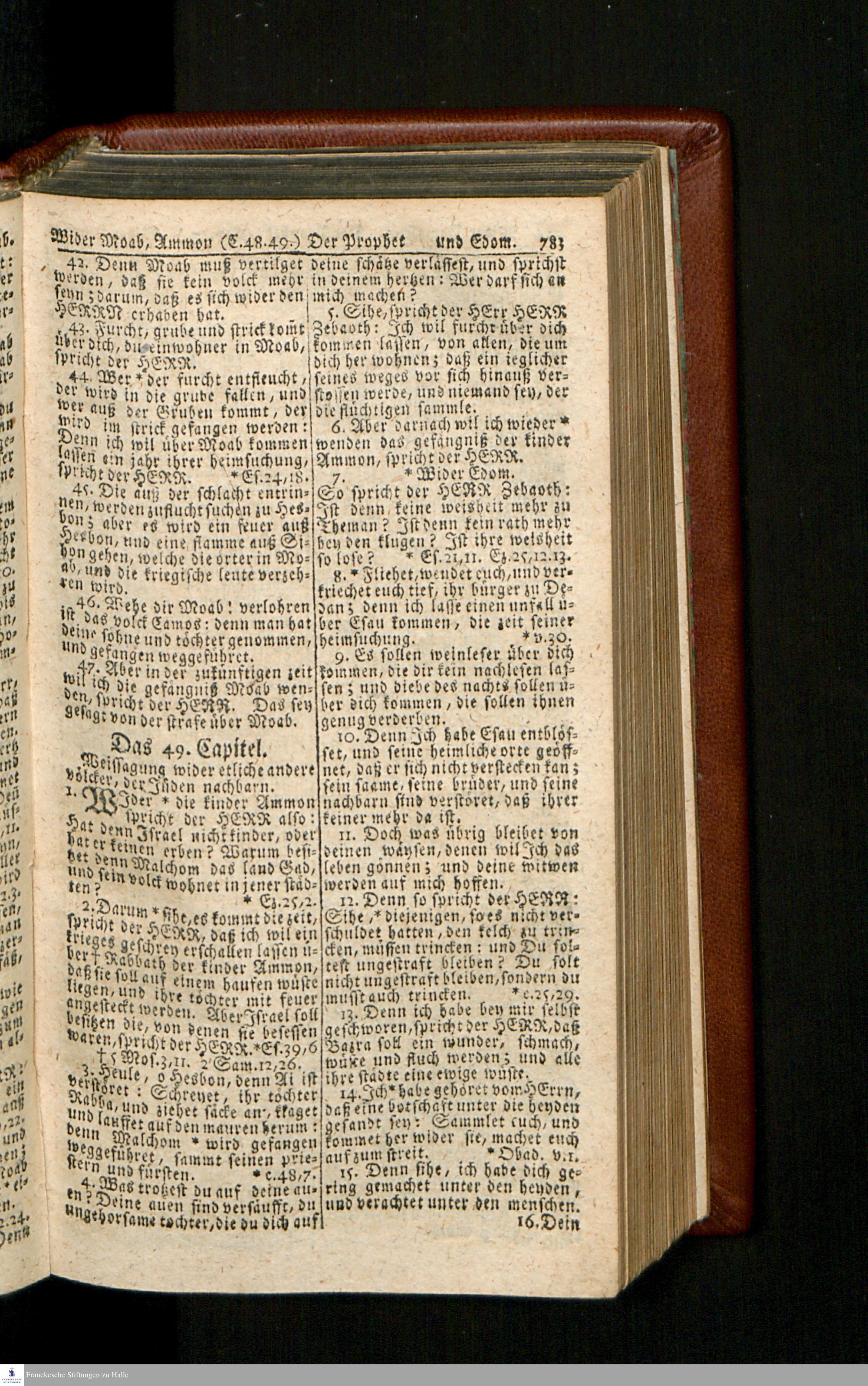 Biblia, Das ist: Die gantze Heil. Schrift Altes und Neues Testaments / Nach der Teutschen Ubersetzung D. Martin Luthers; Mit iedes Capitels kurtzen Summarien/ und nöthigsten Parallelen; Mit Fleiß übersehen, Und gegen einige/ sonderlich erstere/ Editiones des sel. Mannes gehalten, auch an unterschiedlichen Orten nach denselben eingerichtet, und von vielen in den bisherigen Exemplarien hin und wieder eingeschlichenen druckfehlern gesaubert. Nebst einer Vorrede Hn. Baron Carl Hildebrands v. Canstein.