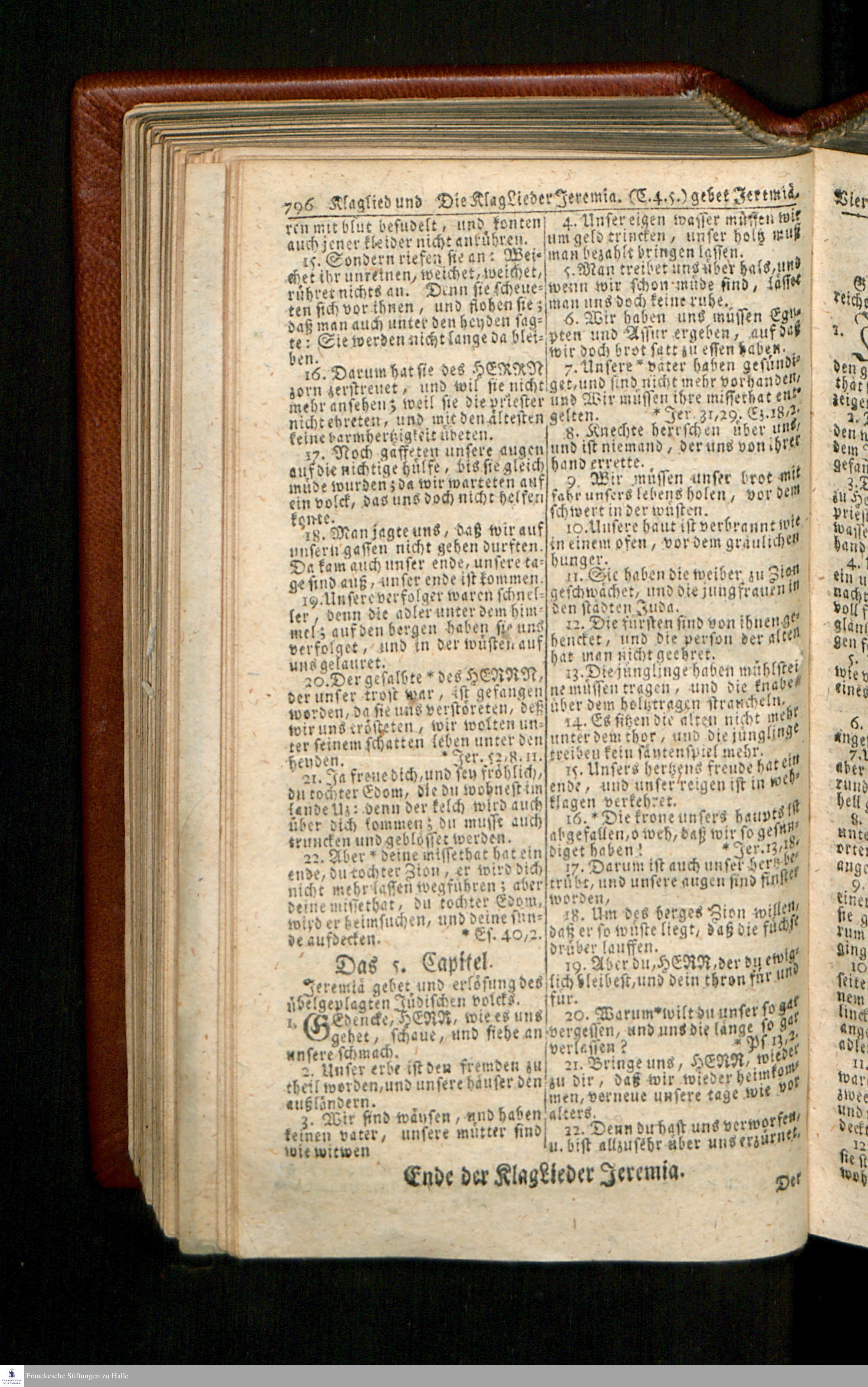 Biblia, Das ist: Die gantze Heil. Schrift Altes und Neues Testaments / Nach der Teutschen Ubersetzung D. Martin Luthers; Mit iedes Capitels kurtzen Summarien/ und nöthigsten Parallelen; Mit Fleiß übersehen, Und gegen einige/ sonderlich erstere/ Editiones des sel. Mannes gehalten, auch an unterschiedlichen Orten nach denselben eingerichtet, und von vielen in den bisherigen Exemplarien hin und wieder eingeschlichenen druckfehlern gesaubert. Nebst einer Vorrede Hn. Baron Carl Hildebrands v. Canstein.