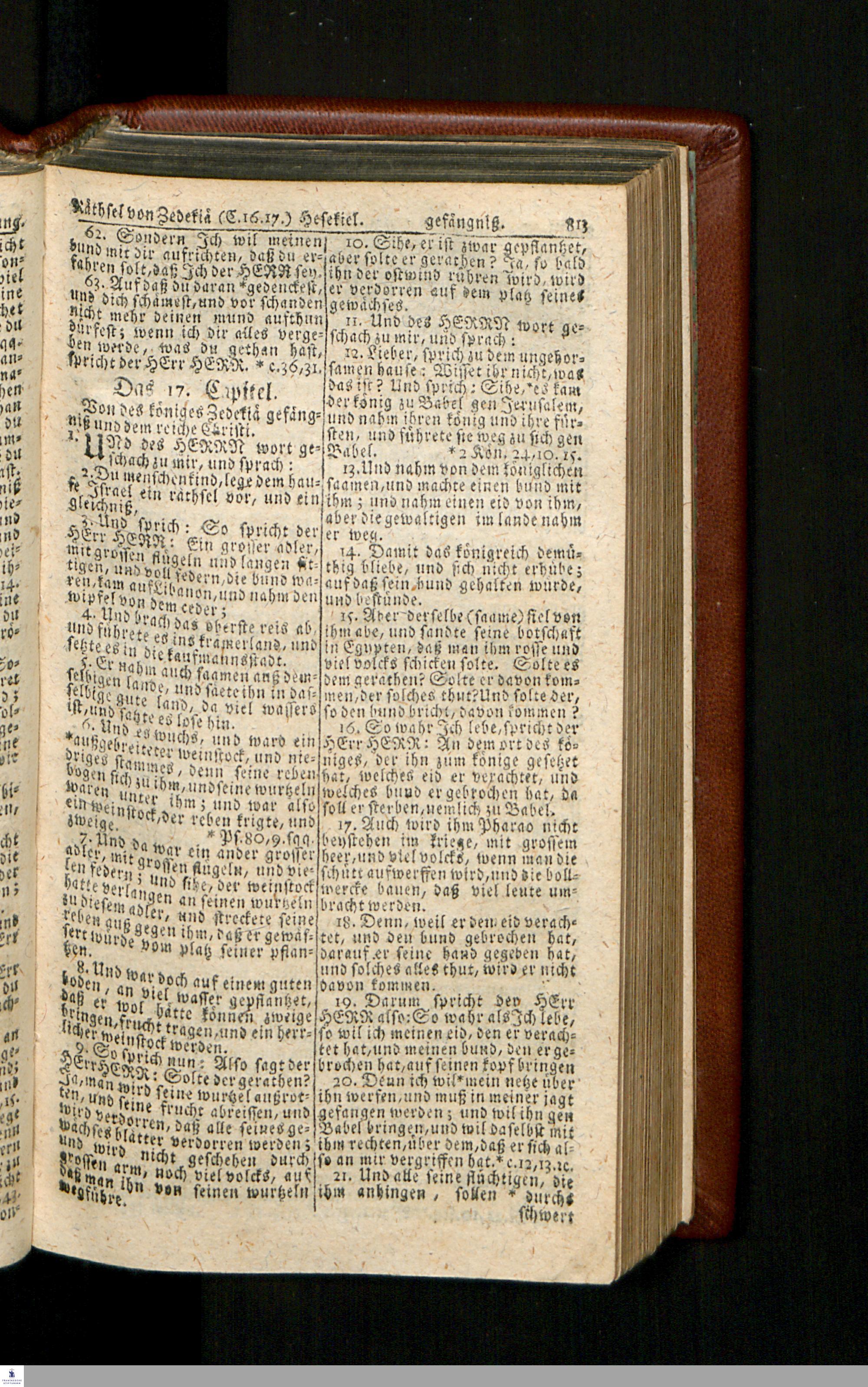 Biblia, Das ist: Die gantze Heil. Schrift Altes und Neues Testaments / Nach der Teutschen Ubersetzung D. Martin Luthers; Mit iedes Capitels kurtzen Summarien/ und nöthigsten Parallelen; Mit Fleiß übersehen, Und gegen einige/ sonderlich erstere/ Editiones des sel. Mannes gehalten, auch an unterschiedlichen Orten nach denselben eingerichtet, und von vielen in den bisherigen Exemplarien hin und wieder eingeschlichenen druckfehlern gesaubert. Nebst einer Vorrede Hn. Baron Carl Hildebrands v. Canstein.