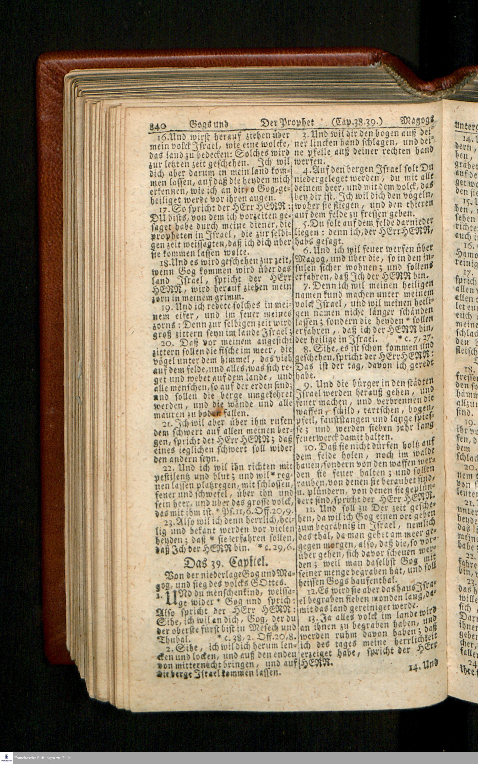 Biblia, Das ist: Die gantze Heil. Schrift Altes und Neues Testaments / Nach der Teutschen Ubersetzung D. Martin Luthers; Mit iedes Capitels kurtzen Summarien/ und nöthigsten Parallelen; Mit Fleiß übersehen, Und gegen einige/ sonderlich erstere/ Editiones des sel. Mannes gehalten, auch an unterschiedlichen Orten nach denselben eingerichtet, und von vielen in den bisherigen Exemplarien hin und wieder eingeschlichenen druckfehlern gesaubert. Nebst einer Vorrede Hn. Baron Carl Hildebrands v. Canstein.