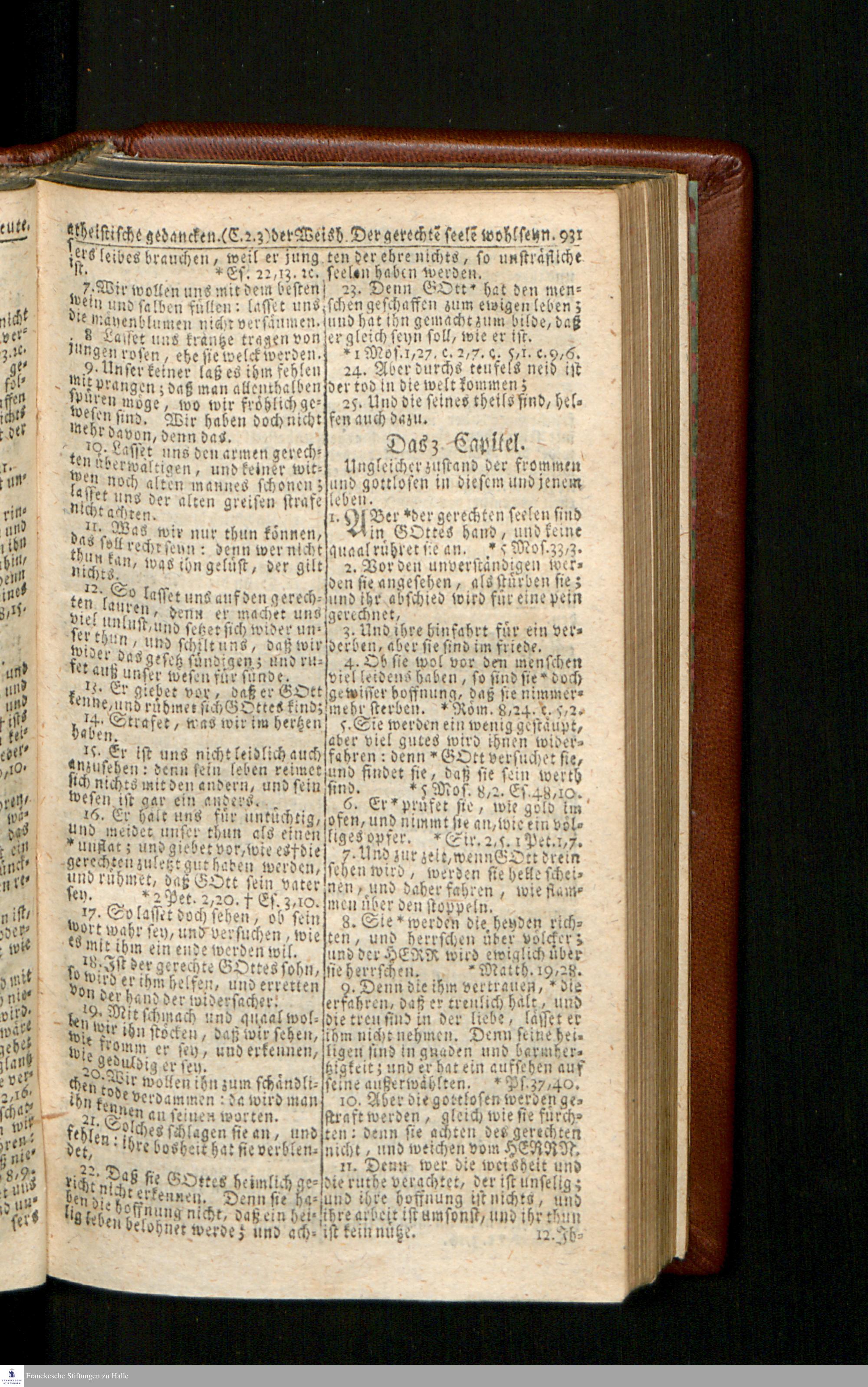 Biblia, Das ist: Die gantze Heil. Schrift Altes und Neues Testaments / Nach der Teutschen Ubersetzung D. Martin Luthers; Mit iedes Capitels kurtzen Summarien/ und nöthigsten Parallelen; Mit Fleiß übersehen, Und gegen einige/ sonderlich erstere/ Editiones des sel. Mannes gehalten, auch an unterschiedlichen Orten nach denselben eingerichtet, und von vielen in den bisherigen Exemplarien hin und wieder eingeschlichenen druckfehlern gesaubert. Nebst einer Vorrede Hn. Baron Carl Hildebrands v. Canstein.