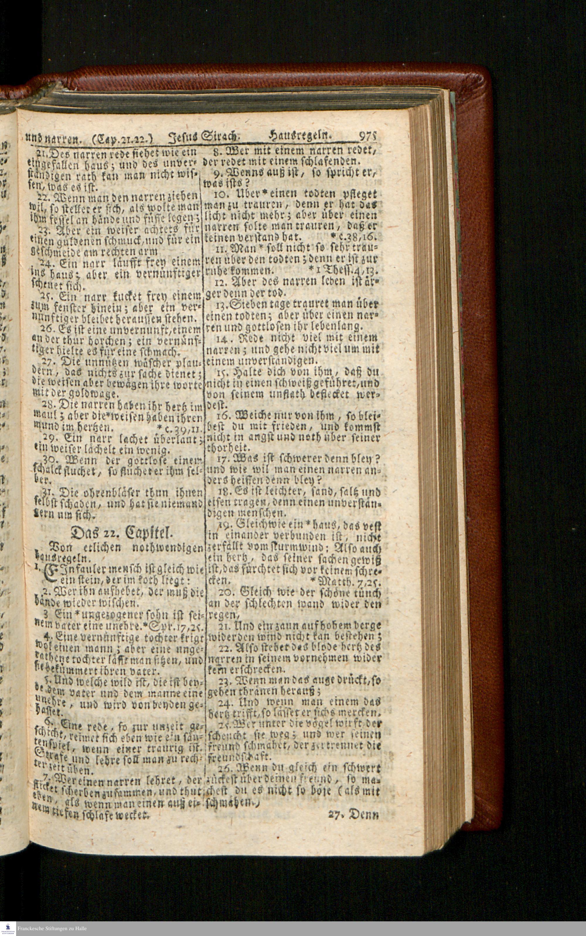 Biblia, Das ist: Die gantze Heil. Schrift Altes und Neues Testaments / Nach der Teutschen Ubersetzung D. Martin Luthers; Mit iedes Capitels kurtzen Summarien/ und nöthigsten Parallelen; Mit Fleiß übersehen, Und gegen einige/ sonderlich erstere/ Editiones des sel. Mannes gehalten, auch an unterschiedlichen Orten nach denselben eingerichtet, und von vielen in den bisherigen Exemplarien hin und wieder eingeschlichenen druckfehlern gesaubert. Nebst einer Vorrede Hn. Baron Carl Hildebrands v. Canstein.