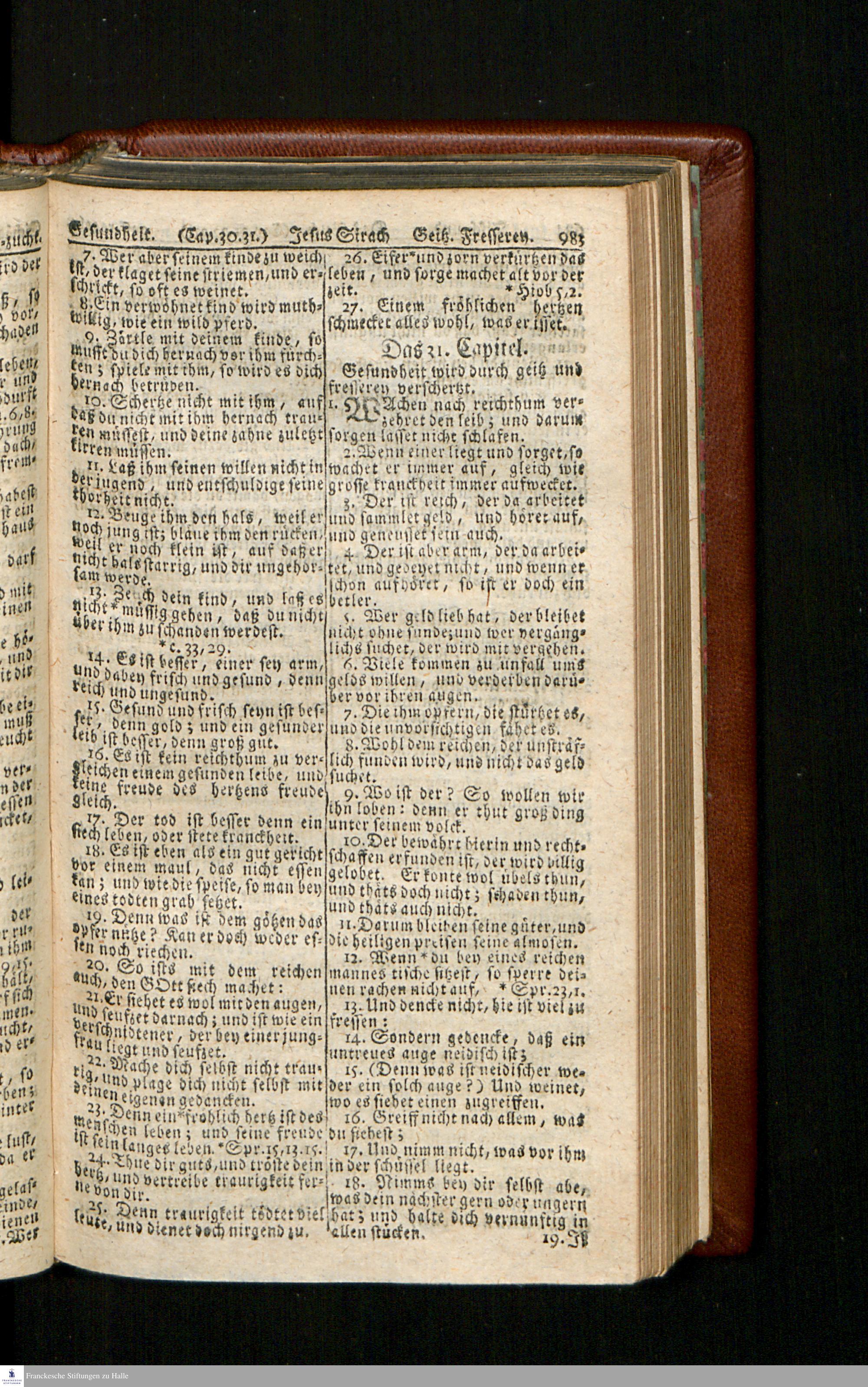Biblia, Das ist: Die gantze Heil. Schrift Altes und Neues Testaments / Nach der Teutschen Ubersetzung D. Martin Luthers; Mit iedes Capitels kurtzen Summarien/ und nöthigsten Parallelen; Mit Fleiß übersehen, Und gegen einige/ sonderlich erstere/ Editiones des sel. Mannes gehalten, auch an unterschiedlichen Orten nach denselben eingerichtet, und von vielen in den bisherigen Exemplarien hin und wieder eingeschlichenen druckfehlern gesaubert. Nebst einer Vorrede Hn. Baron Carl Hildebrands v. Canstein.