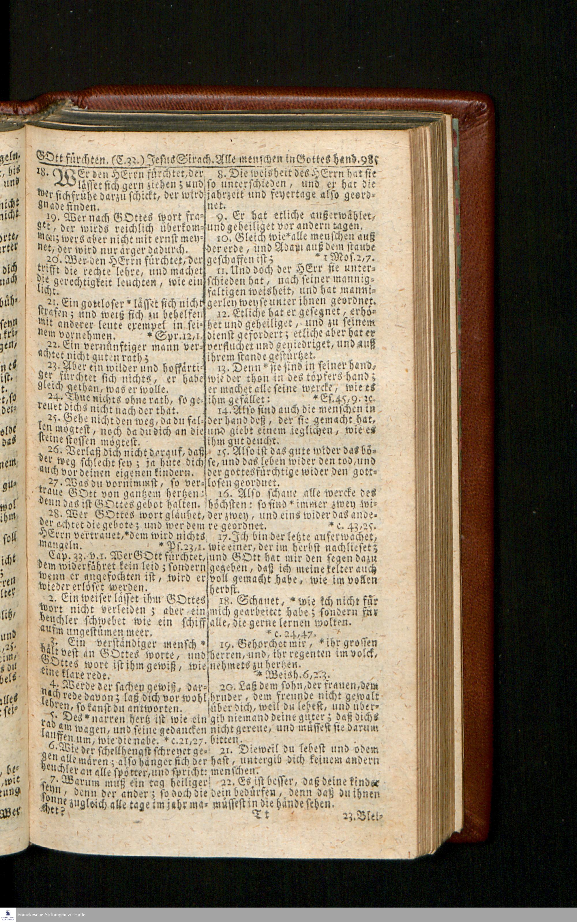 Biblia, Das ist: Die gantze Heil. Schrift Altes und Neues Testaments / Nach der Teutschen Ubersetzung D. Martin Luthers; Mit iedes Capitels kurtzen Summarien/ und nöthigsten Parallelen; Mit Fleiß übersehen, Und gegen einige/ sonderlich erstere/ Editiones des sel. Mannes gehalten, auch an unterschiedlichen Orten nach denselben eingerichtet, und von vielen in den bisherigen Exemplarien hin und wieder eingeschlichenen druckfehlern gesaubert. Nebst einer Vorrede Hn. Baron Carl Hildebrands v. Canstein.