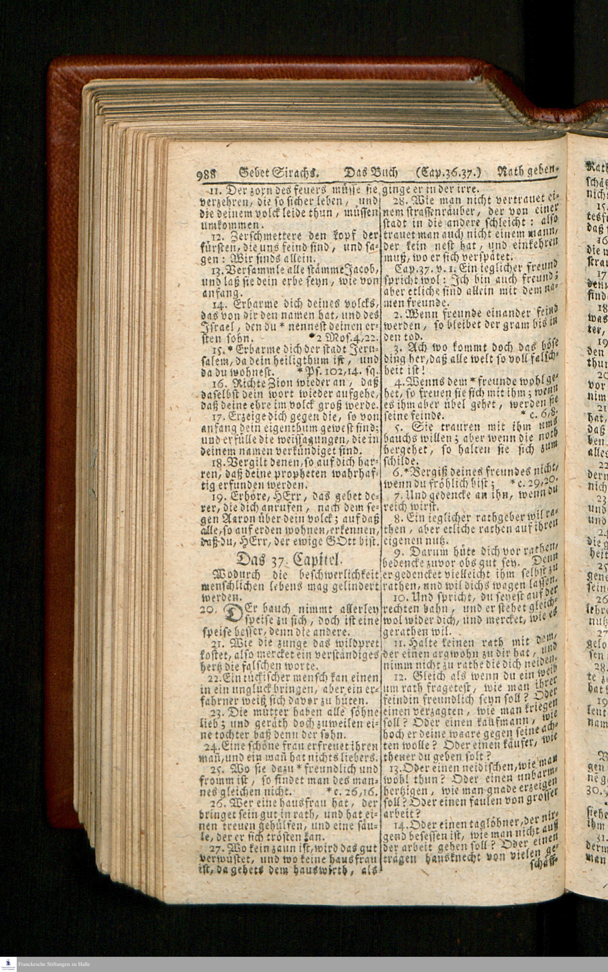 Biblia, Das ist: Die gantze Heil. Schrift Altes und Neues Testaments / Nach der Teutschen Ubersetzung D. Martin Luthers; Mit iedes Capitels kurtzen Summarien/ und nöthigsten Parallelen; Mit Fleiß übersehen, Und gegen einige/ sonderlich erstere/ Editiones des sel. Mannes gehalten, auch an unterschiedlichen Orten nach denselben eingerichtet, und von vielen in den bisherigen Exemplarien hin und wieder eingeschlichenen druckfehlern gesaubert. Nebst einer Vorrede Hn. Baron Carl Hildebrands v. Canstein.