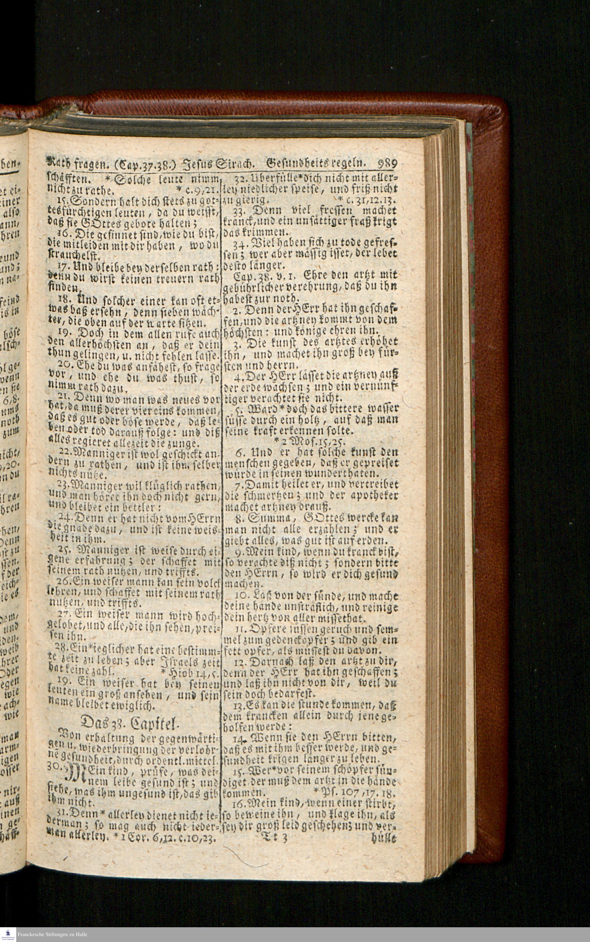 Biblia, Das ist: Die gantze Heil. Schrift Altes und Neues Testaments / Nach der Teutschen Ubersetzung D. Martin Luthers; Mit iedes Capitels kurtzen Summarien/ und nöthigsten Parallelen; Mit Fleiß übersehen, Und gegen einige/ sonderlich erstere/ Editiones des sel. Mannes gehalten, auch an unterschiedlichen Orten nach denselben eingerichtet, und von vielen in den bisherigen Exemplarien hin und wieder eingeschlichenen druckfehlern gesaubert. Nebst einer Vorrede Hn. Baron Carl Hildebrands v. Canstein.