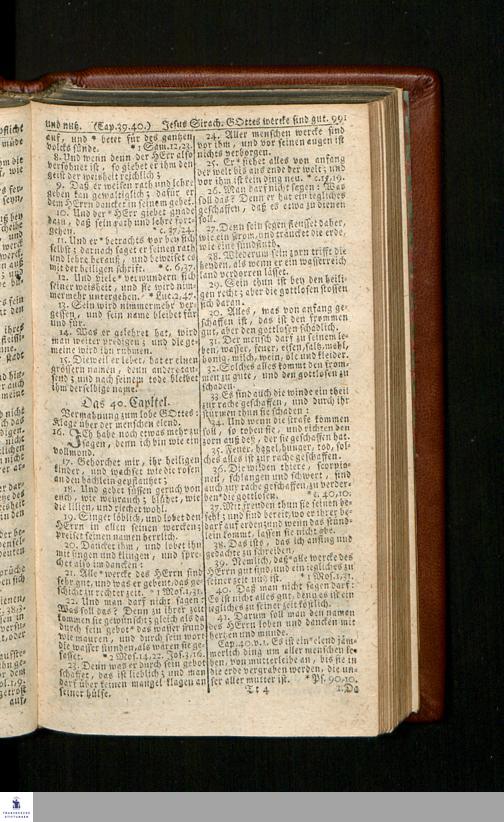 Biblia, Das ist: Die gantze Heil. Schrift Altes und Neues Testaments / Nach der Teutschen Ubersetzung D. Martin Luthers; Mit iedes Capitels kurtzen Summarien/ und nöthigsten Parallelen; Mit Fleiß übersehen, Und gegen einige/ sonderlich erstere/ Editiones des sel. Mannes gehalten, auch an unterschiedlichen Orten nach denselben eingerichtet, und von vielen in den bisherigen Exemplarien hin und wieder eingeschlichenen druckfehlern gesaubert. Nebst einer Vorrede Hn. Baron Carl Hildebrands v. Canstein.