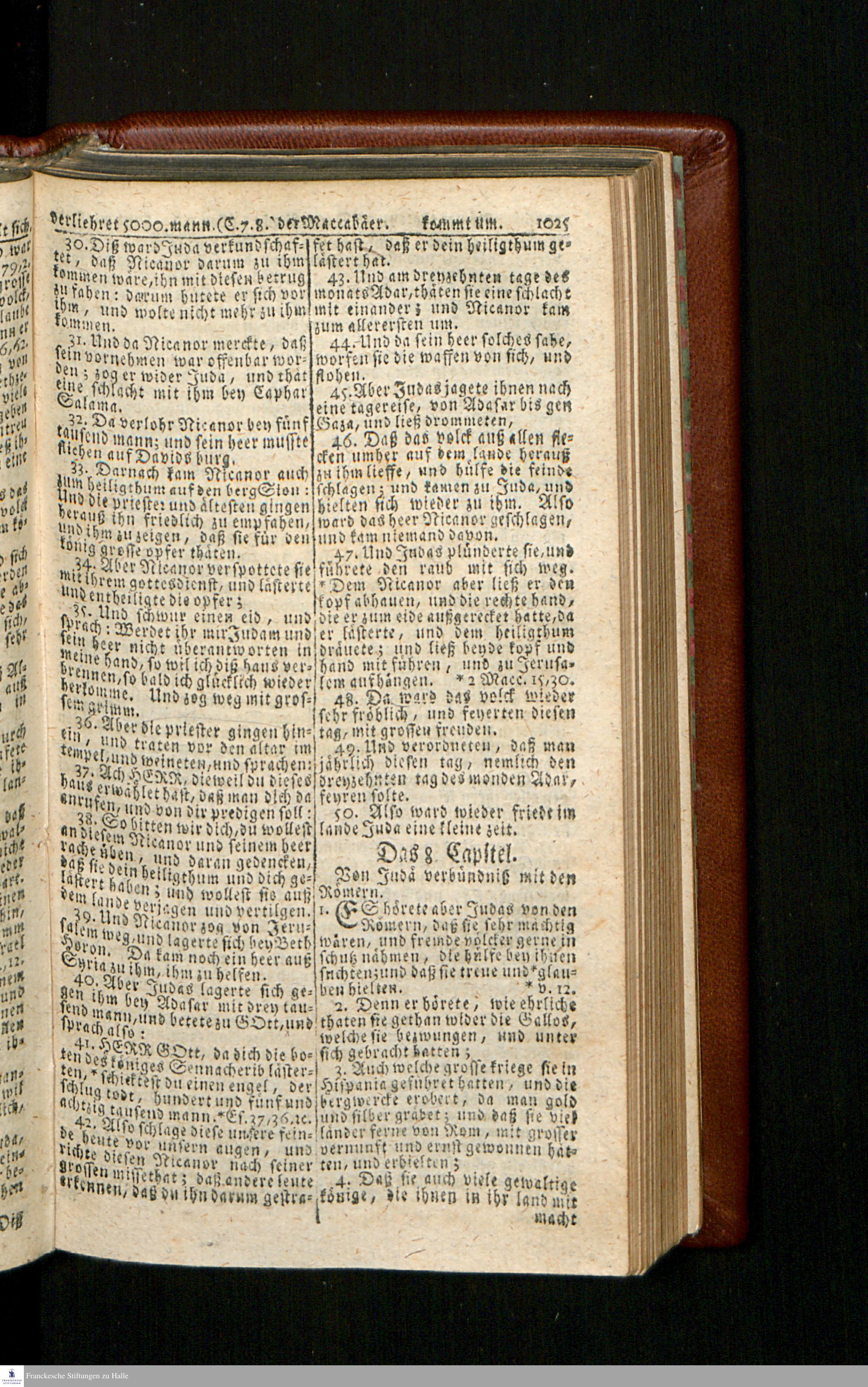Biblia, Das ist: Die gantze Heil. Schrift Altes und Neues Testaments / Nach der Teutschen Ubersetzung D. Martin Luthers; Mit iedes Capitels kurtzen Summarien/ und nöthigsten Parallelen; Mit Fleiß übersehen, Und gegen einige/ sonderlich erstere/ Editiones des sel. Mannes gehalten, auch an unterschiedlichen Orten nach denselben eingerichtet, und von vielen in den bisherigen Exemplarien hin und wieder eingeschlichenen druckfehlern gesaubert. Nebst einer Vorrede Hn. Baron Carl Hildebrands v. Canstein.