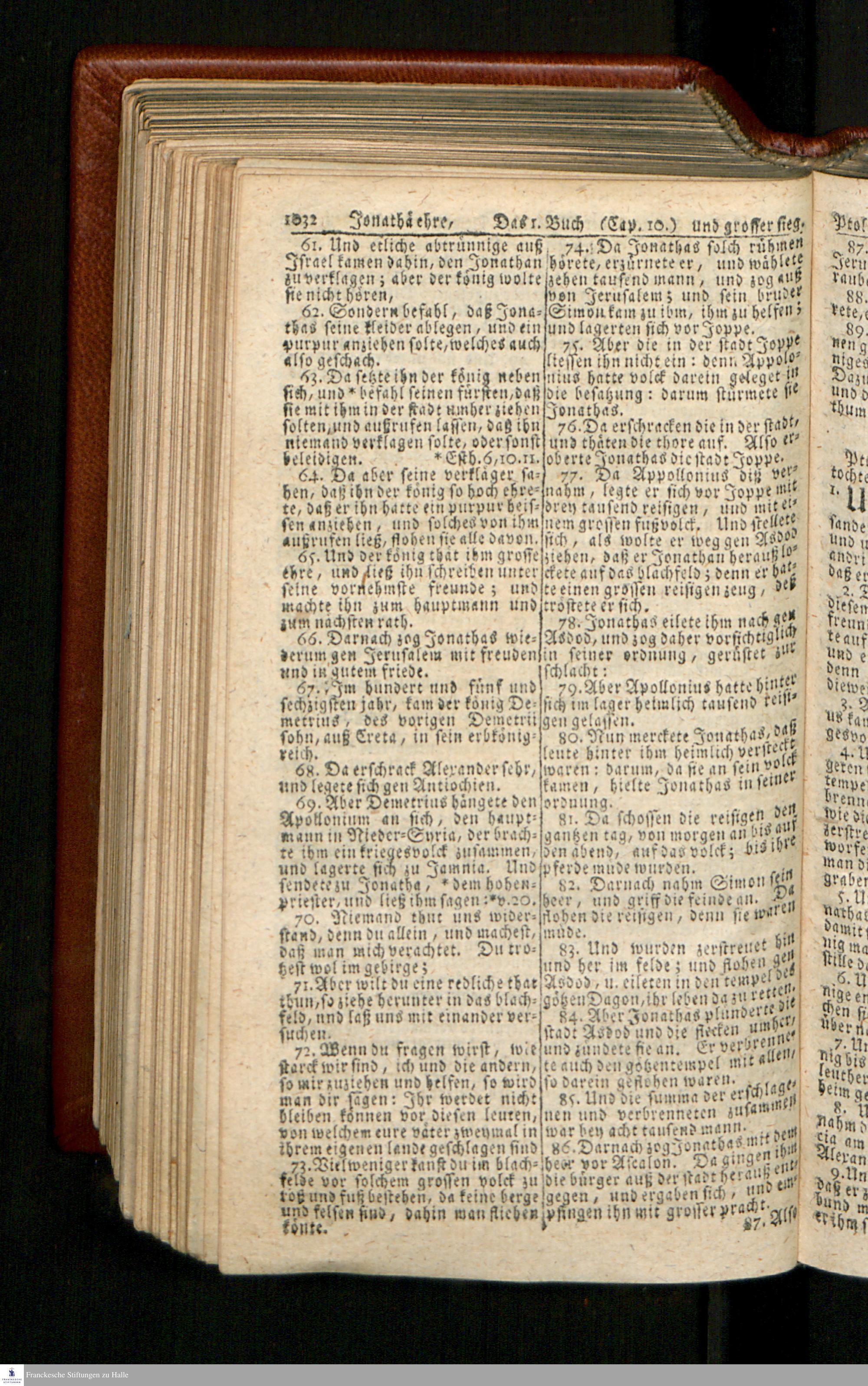 Biblia, Das ist: Die gantze Heil. Schrift Altes und Neues Testaments / Nach der Teutschen Ubersetzung D. Martin Luthers; Mit iedes Capitels kurtzen Summarien/ und nöthigsten Parallelen; Mit Fleiß übersehen, Und gegen einige/ sonderlich erstere/ Editiones des sel. Mannes gehalten, auch an unterschiedlichen Orten nach denselben eingerichtet, und von vielen in den bisherigen Exemplarien hin und wieder eingeschlichenen druckfehlern gesaubert. Nebst einer Vorrede Hn. Baron Carl Hildebrands v. Canstein.