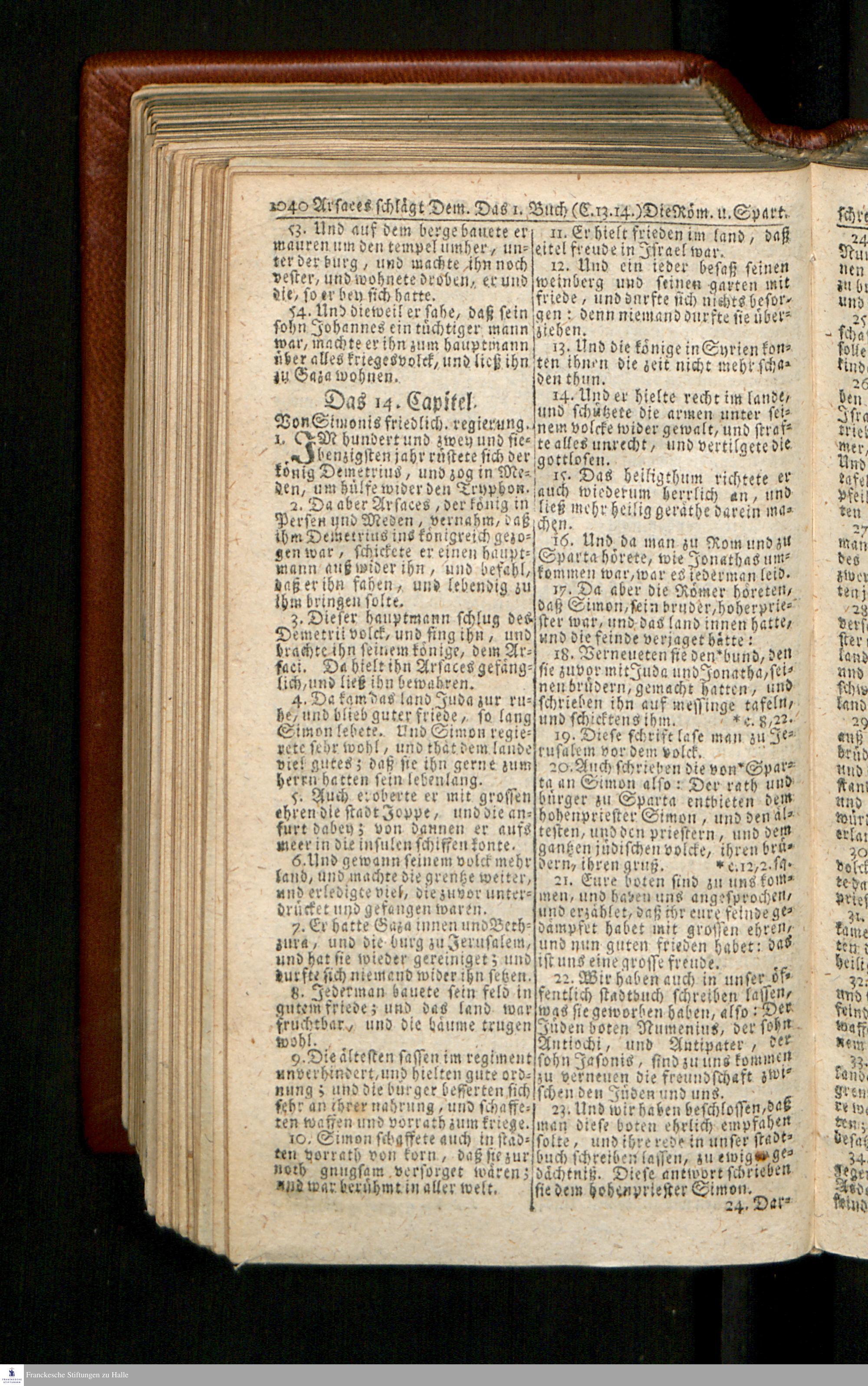 Biblia, Das ist: Die gantze Heil. Schrift Altes und Neues Testaments / Nach der Teutschen Ubersetzung D. Martin Luthers; Mit iedes Capitels kurtzen Summarien/ und nöthigsten Parallelen; Mit Fleiß übersehen, Und gegen einige/ sonderlich erstere/ Editiones des sel. Mannes gehalten, auch an unterschiedlichen Orten nach denselben eingerichtet, und von vielen in den bisherigen Exemplarien hin und wieder eingeschlichenen druckfehlern gesaubert. Nebst einer Vorrede Hn. Baron Carl Hildebrands v. Canstein.