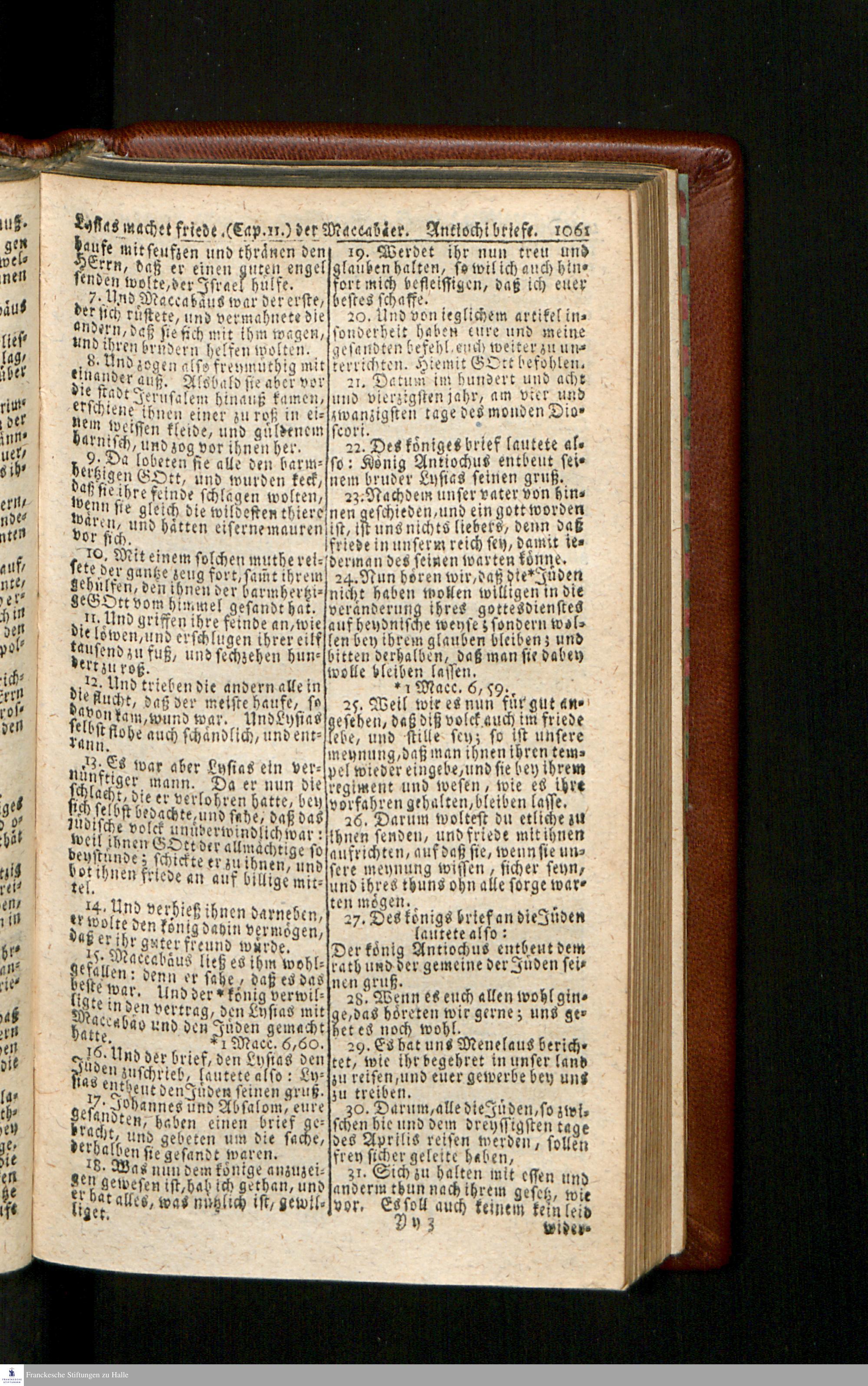 Biblia, Das ist: Die gantze Heil. Schrift Altes und Neues Testaments / Nach der Teutschen Ubersetzung D. Martin Luthers; Mit iedes Capitels kurtzen Summarien/ und nöthigsten Parallelen; Mit Fleiß übersehen, Und gegen einige/ sonderlich erstere/ Editiones des sel. Mannes gehalten, auch an unterschiedlichen Orten nach denselben eingerichtet, und von vielen in den bisherigen Exemplarien hin und wieder eingeschlichenen druckfehlern gesaubert. Nebst einer Vorrede Hn. Baron Carl Hildebrands v. Canstein.
