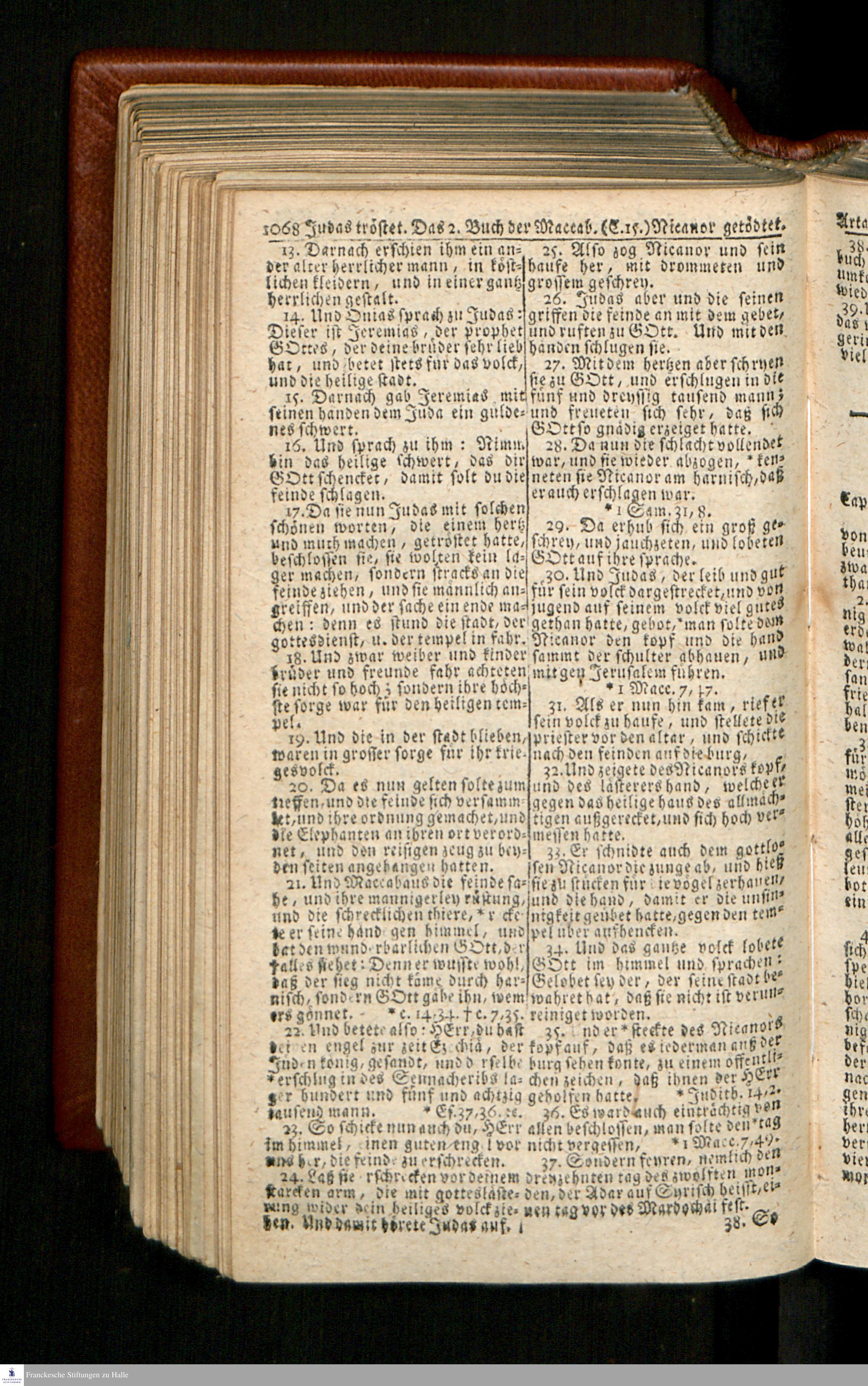 Biblia, Das ist: Die gantze Heil. Schrift Altes und Neues Testaments / Nach der Teutschen Ubersetzung D. Martin Luthers; Mit iedes Capitels kurtzen Summarien/ und nöthigsten Parallelen; Mit Fleiß übersehen, Und gegen einige/ sonderlich erstere/ Editiones des sel. Mannes gehalten, auch an unterschiedlichen Orten nach denselben eingerichtet, und von vielen in den bisherigen Exemplarien hin und wieder eingeschlichenen druckfehlern gesaubert. Nebst einer Vorrede Hn. Baron Carl Hildebrands v. Canstein.