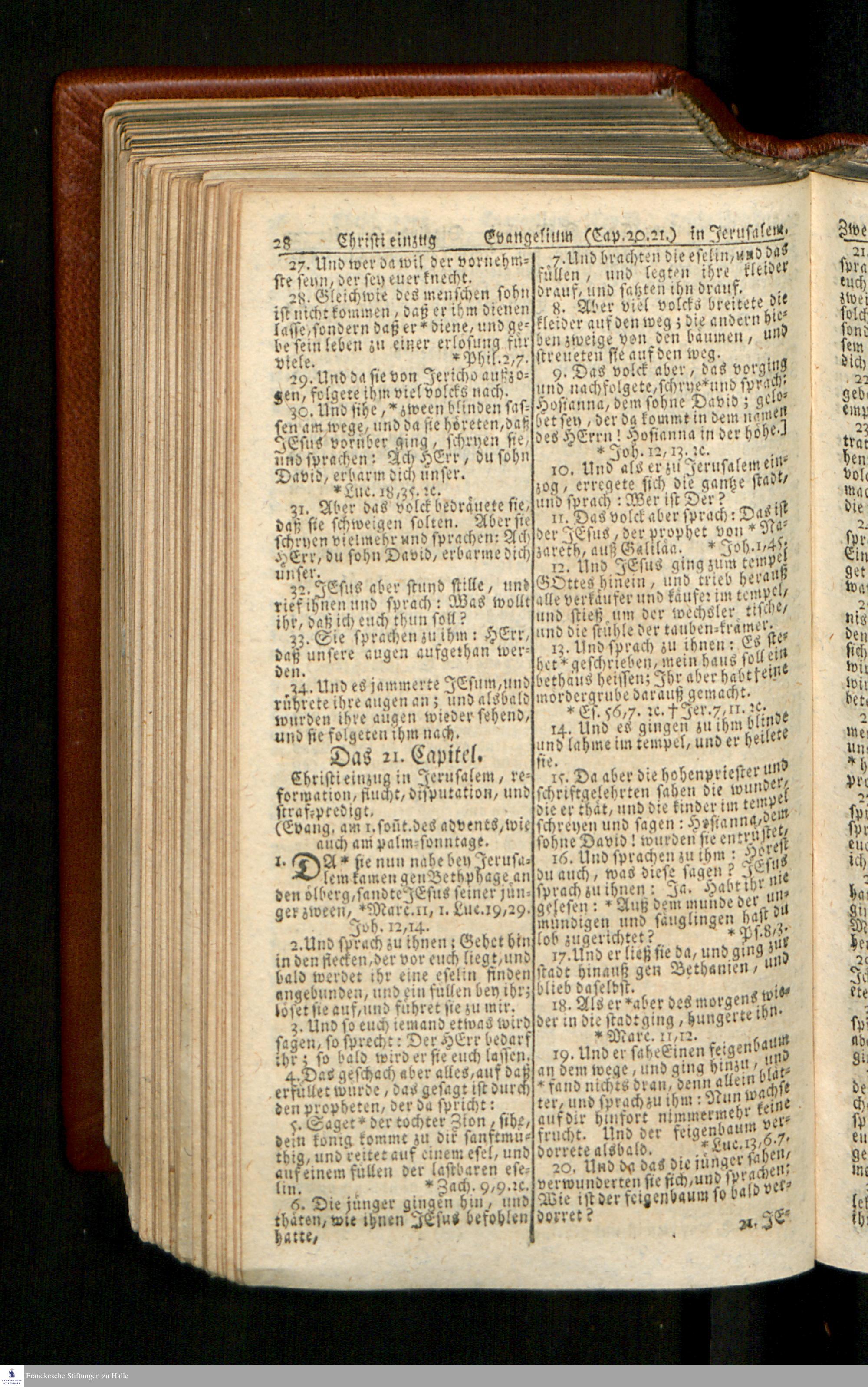 Biblia, Das ist: Die gantze Heil. Schrift Altes und Neues Testaments / Nach der Teutschen Ubersetzung D. Martin Luthers; Mit iedes Capitels kurtzen Summarien/ und nöthigsten Parallelen; Mit Fleiß übersehen, Und gegen einige/ sonderlich erstere/ Editiones des sel. Mannes gehalten, auch an unterschiedlichen Orten nach denselben eingerichtet, und von vielen in den bisherigen Exemplarien hin und wieder eingeschlichenen druckfehlern gesaubert. Nebst einer Vorrede Hn. Baron Carl Hildebrands v. Canstein.