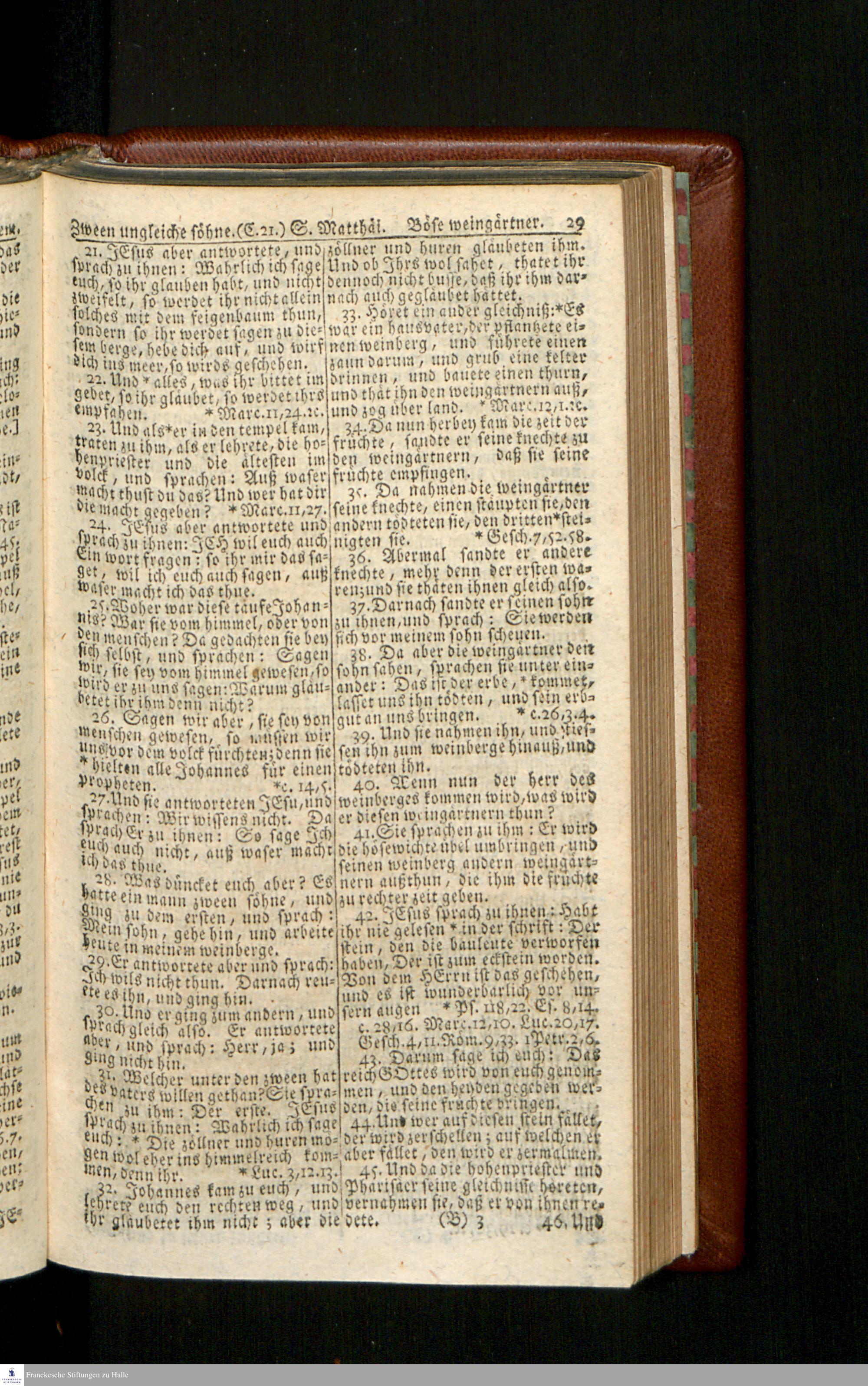 Biblia, Das ist: Die gantze Heil. Schrift Altes und Neues Testaments / Nach der Teutschen Ubersetzung D. Martin Luthers; Mit iedes Capitels kurtzen Summarien/ und nöthigsten Parallelen; Mit Fleiß übersehen, Und gegen einige/ sonderlich erstere/ Editiones des sel. Mannes gehalten, auch an unterschiedlichen Orten nach denselben eingerichtet, und von vielen in den bisherigen Exemplarien hin und wieder eingeschlichenen druckfehlern gesaubert. Nebst einer Vorrede Hn. Baron Carl Hildebrands v. Canstein.