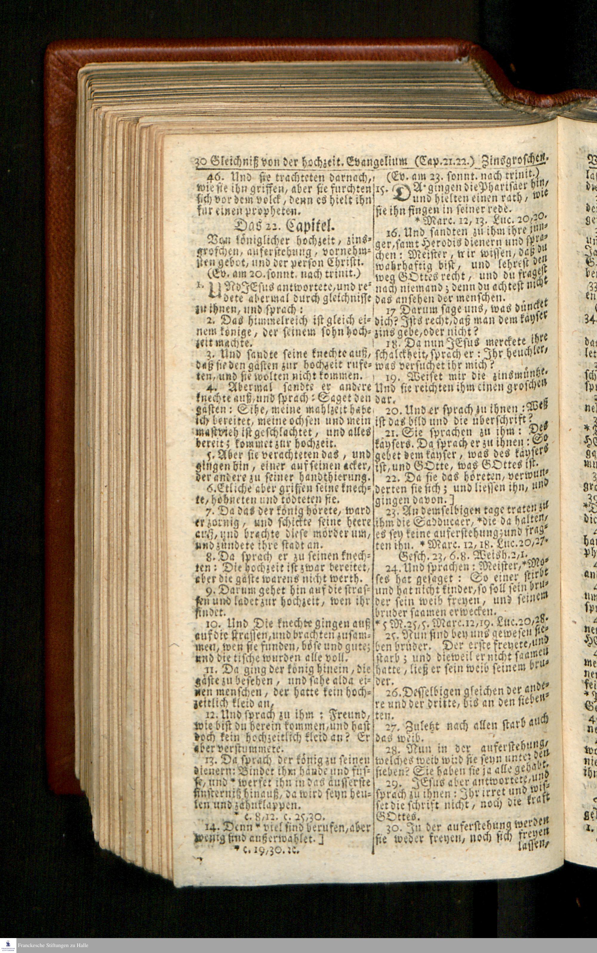 Biblia, Das ist: Die gantze Heil. Schrift Altes und Neues Testaments / Nach der Teutschen Ubersetzung D. Martin Luthers; Mit iedes Capitels kurtzen Summarien/ und nöthigsten Parallelen; Mit Fleiß übersehen, Und gegen einige/ sonderlich erstere/ Editiones des sel. Mannes gehalten, auch an unterschiedlichen Orten nach denselben eingerichtet, und von vielen in den bisherigen Exemplarien hin und wieder eingeschlichenen druckfehlern gesaubert. Nebst einer Vorrede Hn. Baron Carl Hildebrands v. Canstein.