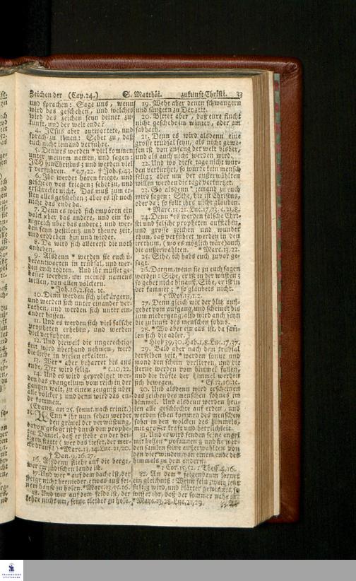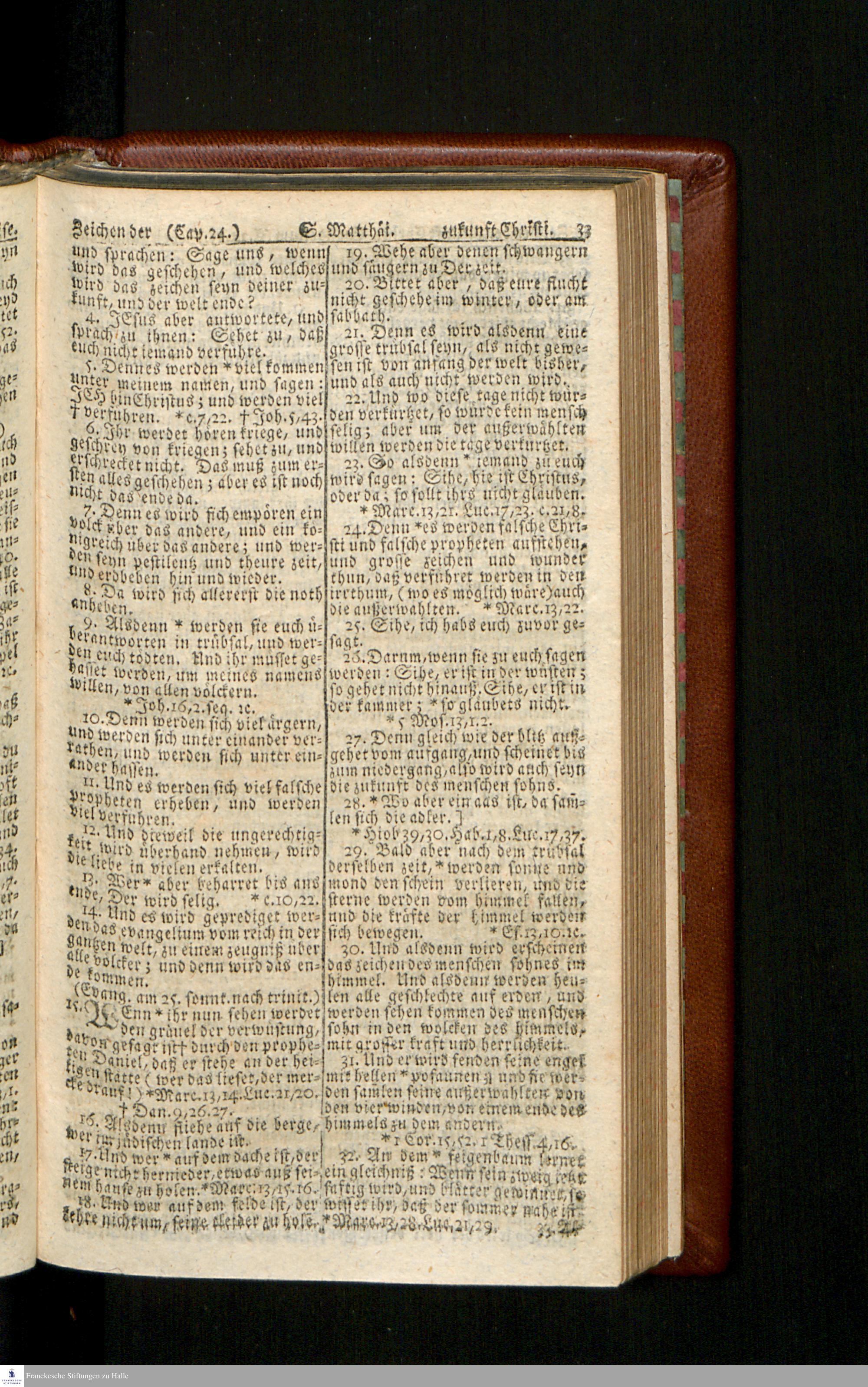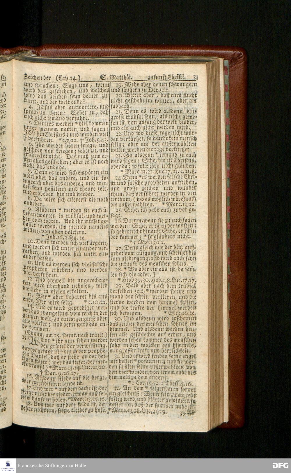 Biblia, Das ist: Die gantze Heil. Schrift Altes und Neues Testaments / Nach der Teutschen Ubersetzung D. Martin Luthers; Mit iedes Capitels kurtzen Summarien/ und nöthigsten Parallelen; Mit Fleiß übersehen, Und gegen einige/ sonderlich erstere/ Editiones des sel. Mannes gehalten, auch an unterschiedlichen Orten nach denselben eingerichtet, und von vielen in den bisherigen Exemplarien hin und wieder eingeschlichenen druckfehlern gesaubert. Nebst einer Vorrede Hn. Baron Carl Hildebrands v. Canstein.