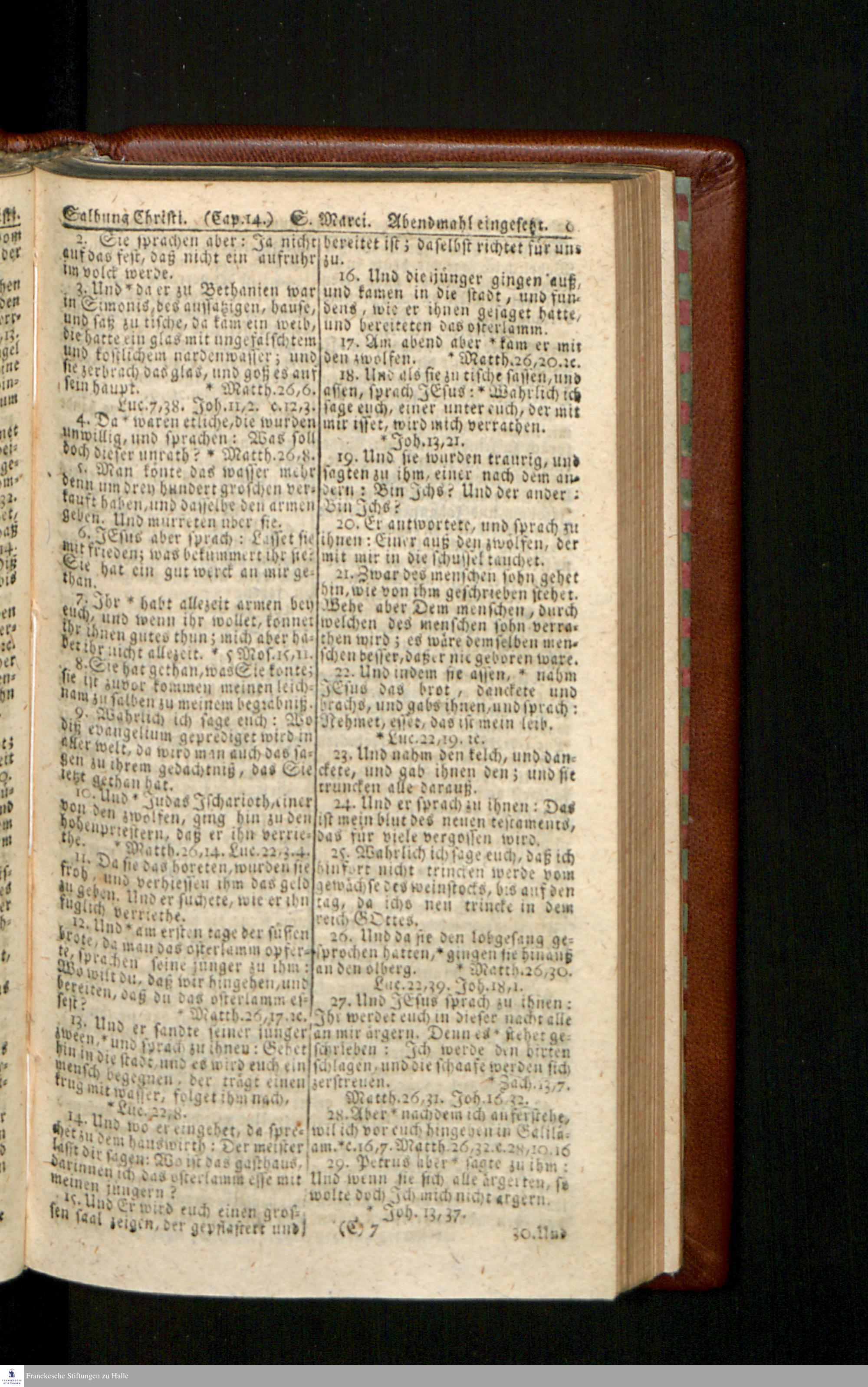 Biblia, Das ist: Die gantze Heil. Schrift Altes und Neues Testaments / Nach der Teutschen Ubersetzung D. Martin Luthers; Mit iedes Capitels kurtzen Summarien/ und nöthigsten Parallelen; Mit Fleiß übersehen, Und gegen einige/ sonderlich erstere/ Editiones des sel. Mannes gehalten, auch an unterschiedlichen Orten nach denselben eingerichtet, und von vielen in den bisherigen Exemplarien hin und wieder eingeschlichenen druckfehlern gesaubert. Nebst einer Vorrede Hn. Baron Carl Hildebrands v. Canstein.