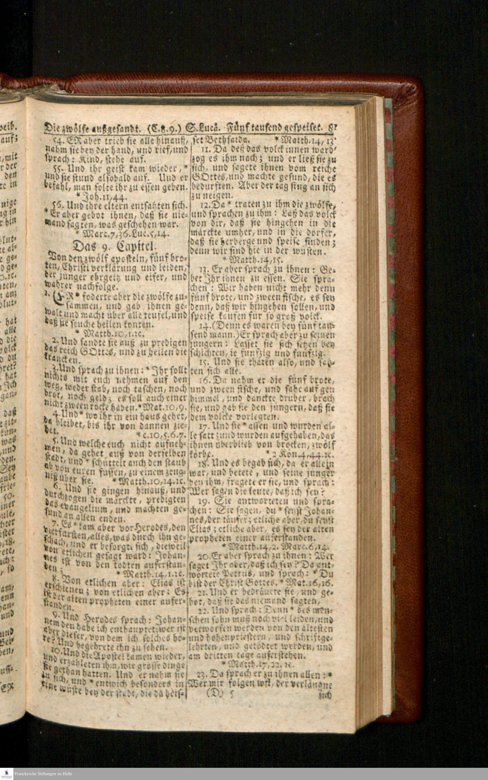 Biblia, Das ist: Die gantze Heil. Schrift Altes und Neues Testaments / Nach der Teutschen Ubersetzung D. Martin Luthers; Mit iedes Capitels kurtzen Summarien/ und nöthigsten Parallelen; Mit Fleiß übersehen, Und gegen einige/ sonderlich erstere/ Editiones des sel. Mannes gehalten, auch an unterschiedlichen Orten nach denselben eingerichtet, und von vielen in den bisherigen Exemplarien hin und wieder eingeschlichenen druckfehlern gesaubert. Nebst einer Vorrede Hn. Baron Carl Hildebrands v. Canstein.