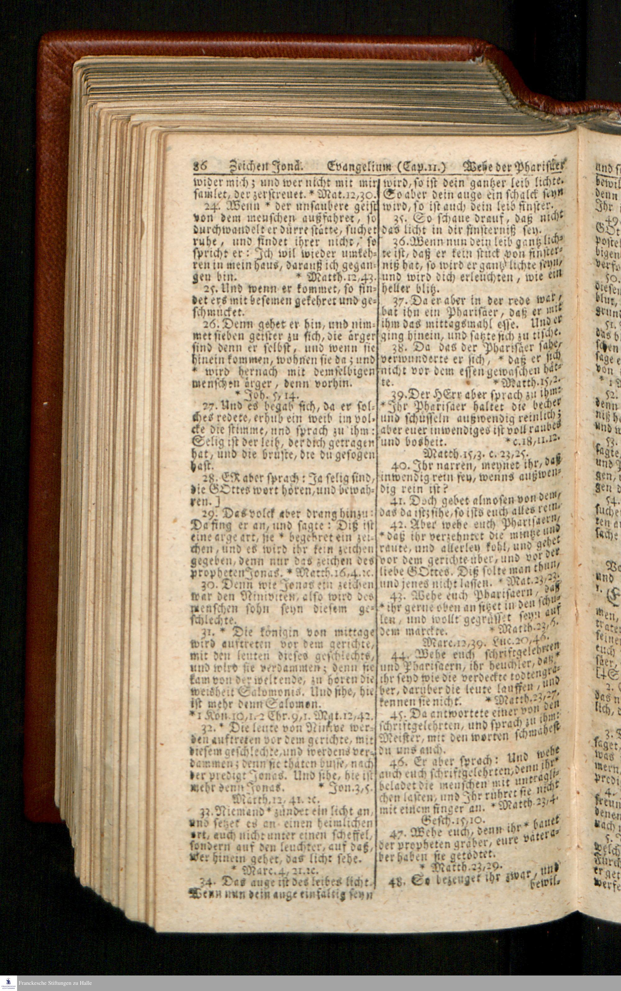 Biblia, Das ist: Die gantze Heil. Schrift Altes und Neues Testaments / Nach der Teutschen Ubersetzung D. Martin Luthers; Mit iedes Capitels kurtzen Summarien/ und nöthigsten Parallelen; Mit Fleiß übersehen, Und gegen einige/ sonderlich erstere/ Editiones des sel. Mannes gehalten, auch an unterschiedlichen Orten nach denselben eingerichtet, und von vielen in den bisherigen Exemplarien hin und wieder eingeschlichenen druckfehlern gesaubert. Nebst einer Vorrede Hn. Baron Carl Hildebrands v. Canstein.