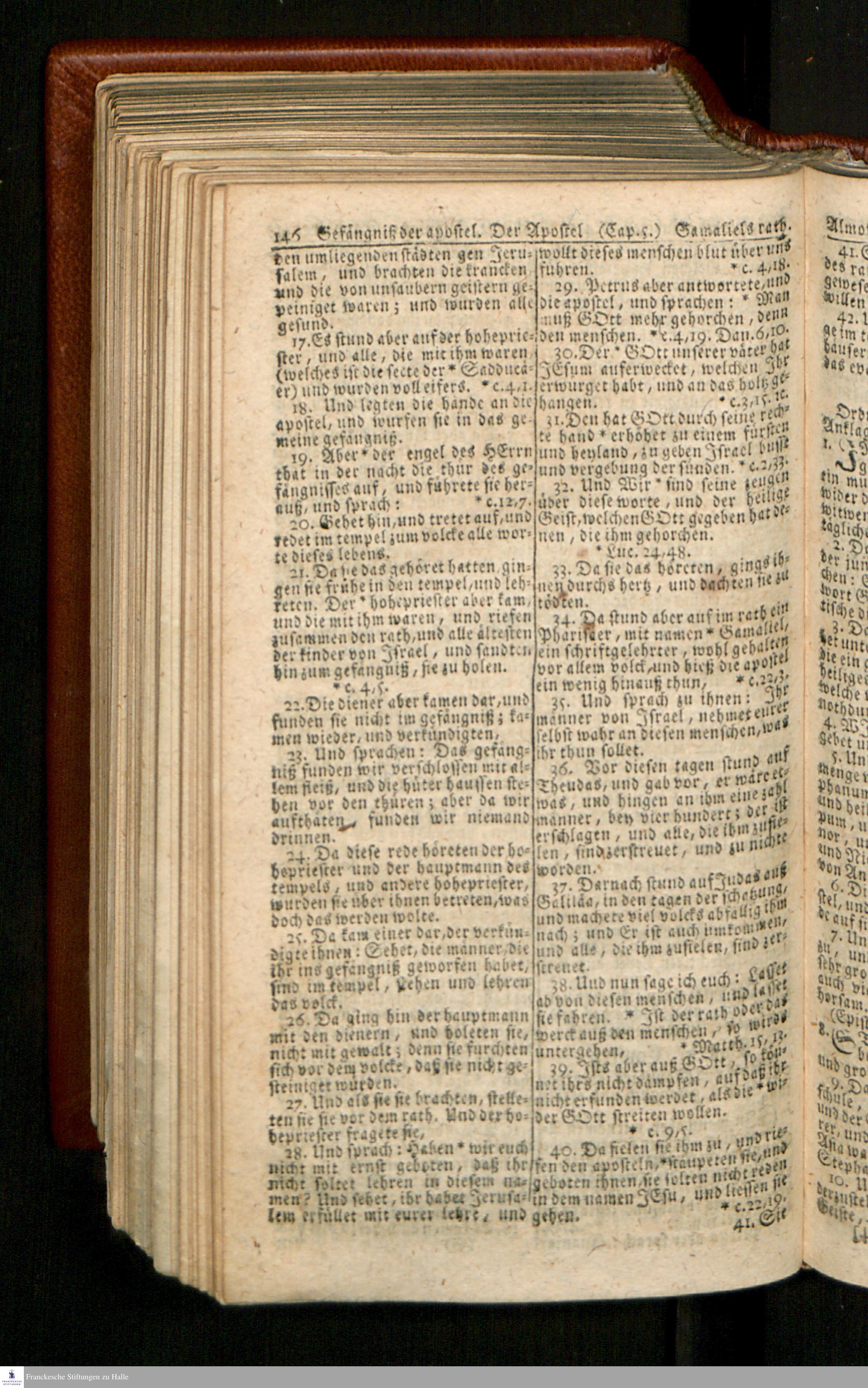 Biblia, Das ist: Die gantze Heil. Schrift Altes und Neues Testaments / Nach der Teutschen Ubersetzung D. Martin Luthers; Mit iedes Capitels kurtzen Summarien/ und nöthigsten Parallelen; Mit Fleiß übersehen, Und gegen einige/ sonderlich erstere/ Editiones des sel. Mannes gehalten, auch an unterschiedlichen Orten nach denselben eingerichtet, und von vielen in den bisherigen Exemplarien hin und wieder eingeschlichenen druckfehlern gesaubert. Nebst einer Vorrede Hn. Baron Carl Hildebrands v. Canstein.