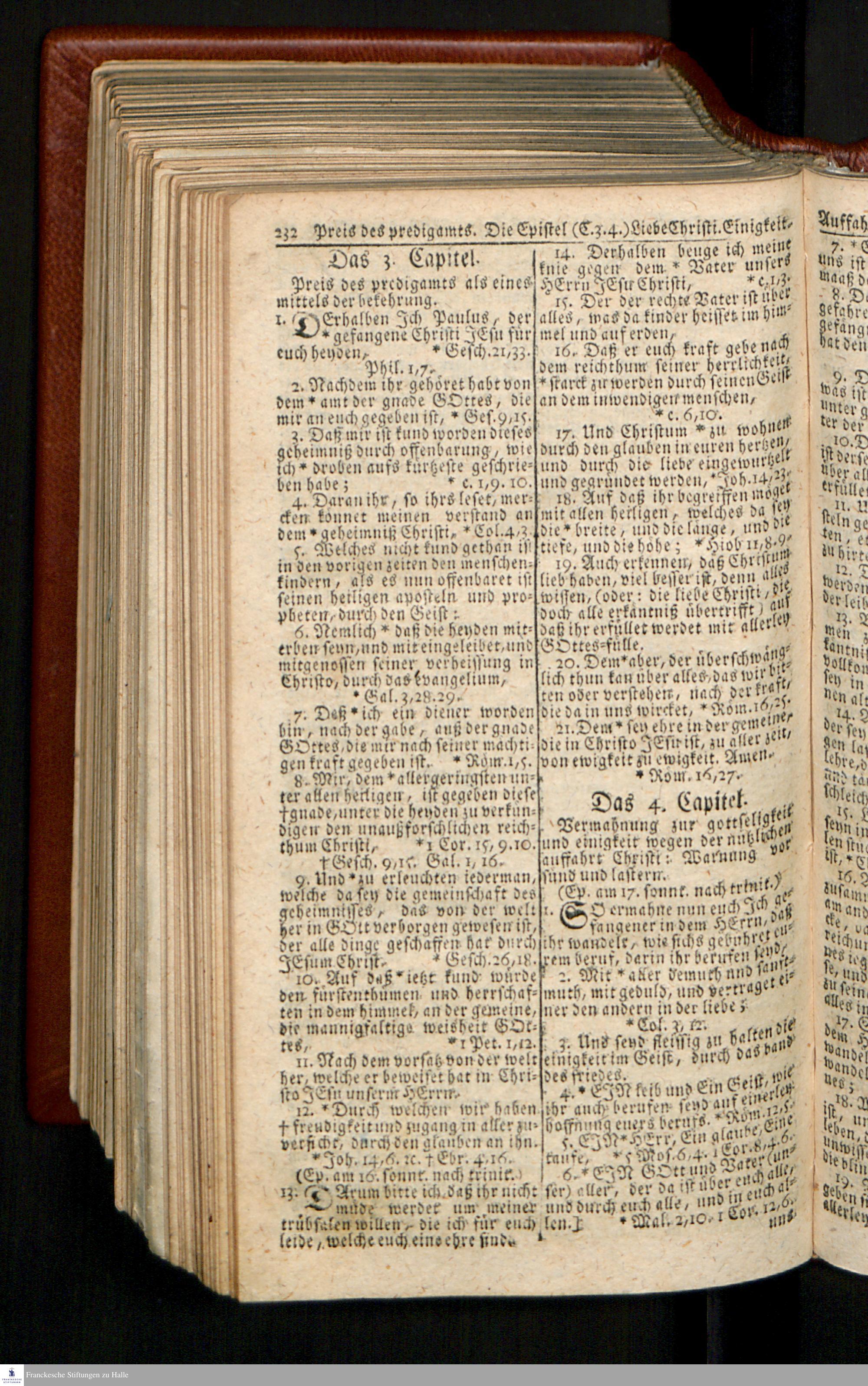 Biblia, Das ist: Die gantze Heil. Schrift Altes und Neues Testaments / Nach der Teutschen Ubersetzung D. Martin Luthers; Mit iedes Capitels kurtzen Summarien/ und nöthigsten Parallelen; Mit Fleiß übersehen, Und gegen einige/ sonderlich erstere/ Editiones des sel. Mannes gehalten, auch an unterschiedlichen Orten nach denselben eingerichtet, und von vielen in den bisherigen Exemplarien hin und wieder eingeschlichenen druckfehlern gesaubert. Nebst einer Vorrede Hn. Baron Carl Hildebrands v. Canstein.