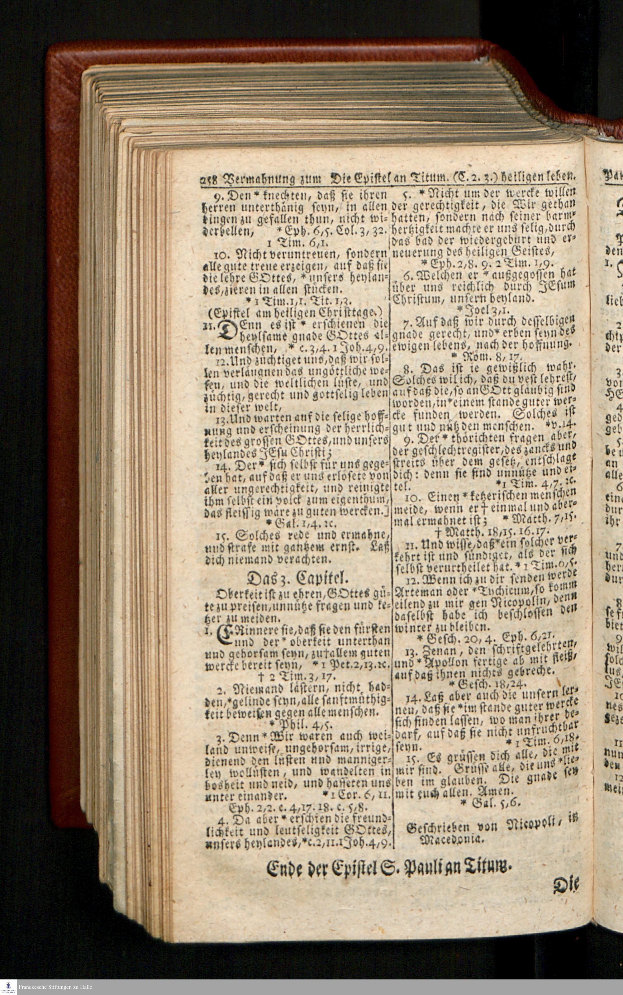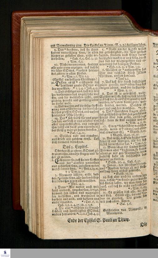Biblia, Das ist: Die gantze Heil. Schrift Altes und Neues Testaments / Nach der Teutschen Ubersetzung D. Martin Luthers; Mit iedes Capitels kurtzen Summarien/ und nöthigsten Parallelen; Mit Fleiß übersehen, Und gegen einige/ sonderlich erstere/ Editiones des sel. Mannes gehalten, auch an unterschiedlichen Orten nach denselben eingerichtet, und von vielen in den bisherigen Exemplarien hin und wieder eingeschlichenen druckfehlern gesaubert. Nebst einer Vorrede Hn. Baron Carl Hildebrands v. Canstein.