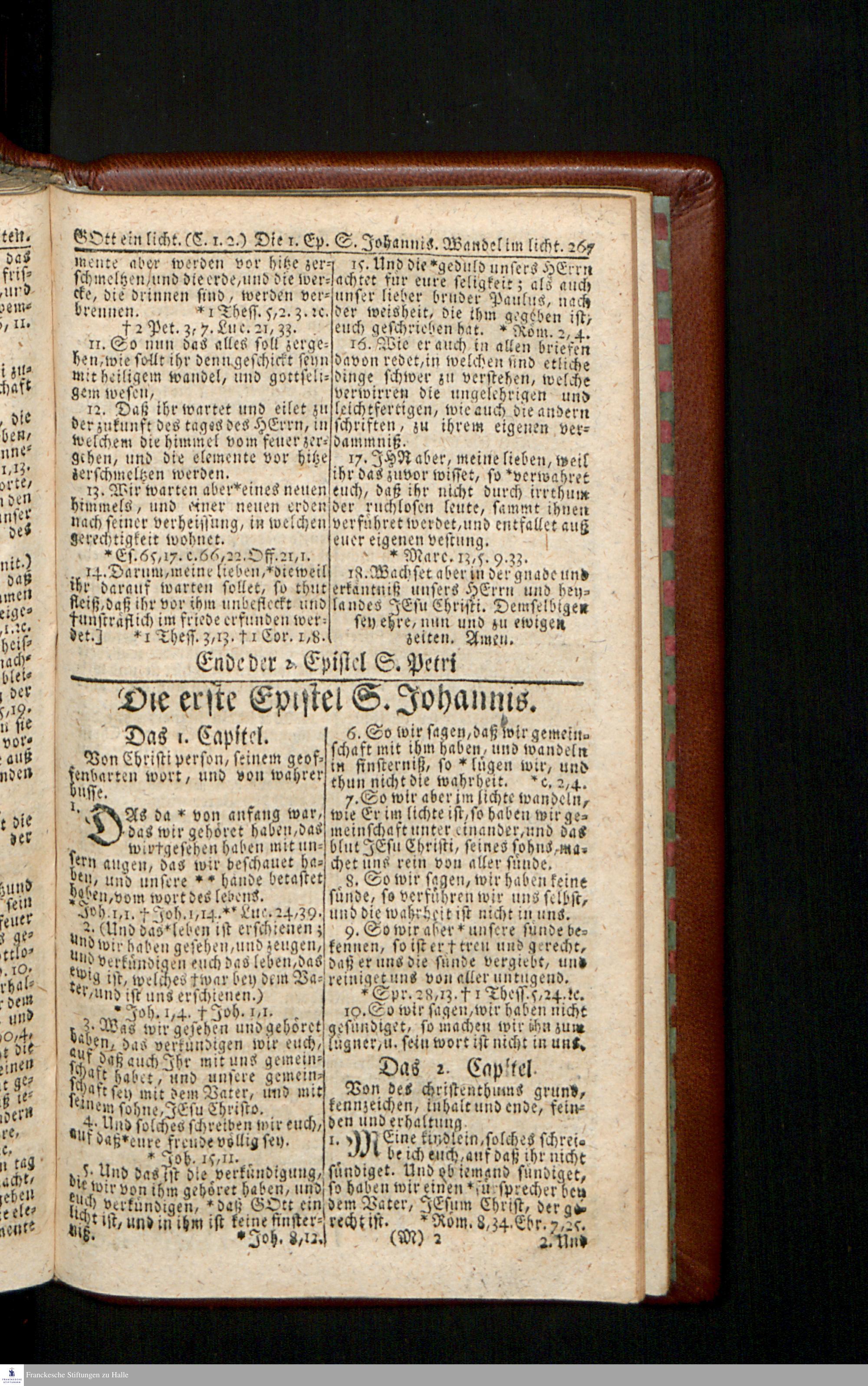 Biblia, Das ist: Die gantze Heil. Schrift Altes und Neues Testaments / Nach der Teutschen Ubersetzung D. Martin Luthers; Mit iedes Capitels kurtzen Summarien/ und nöthigsten Parallelen; Mit Fleiß übersehen, Und gegen einige/ sonderlich erstere/ Editiones des sel. Mannes gehalten, auch an unterschiedlichen Orten nach denselben eingerichtet, und von vielen in den bisherigen Exemplarien hin und wieder eingeschlichenen druckfehlern gesaubert. Nebst einer Vorrede Hn. Baron Carl Hildebrands v. Canstein.