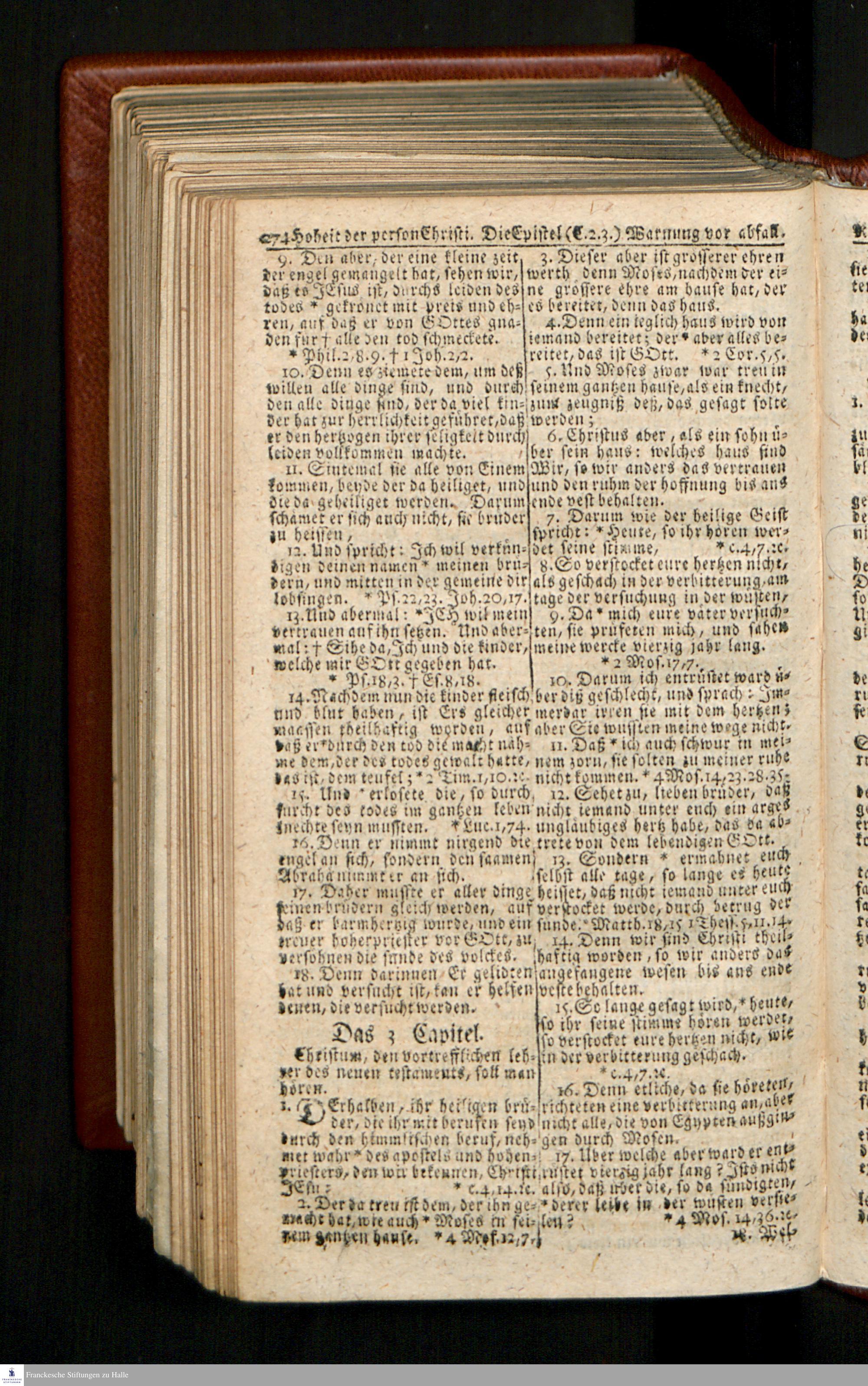 Biblia, Das ist: Die gantze Heil. Schrift Altes und Neues Testaments / Nach der Teutschen Ubersetzung D. Martin Luthers; Mit iedes Capitels kurtzen Summarien/ und nöthigsten Parallelen; Mit Fleiß übersehen, Und gegen einige/ sonderlich erstere/ Editiones des sel. Mannes gehalten, auch an unterschiedlichen Orten nach denselben eingerichtet, und von vielen in den bisherigen Exemplarien hin und wieder eingeschlichenen druckfehlern gesaubert. Nebst einer Vorrede Hn. Baron Carl Hildebrands v. Canstein.