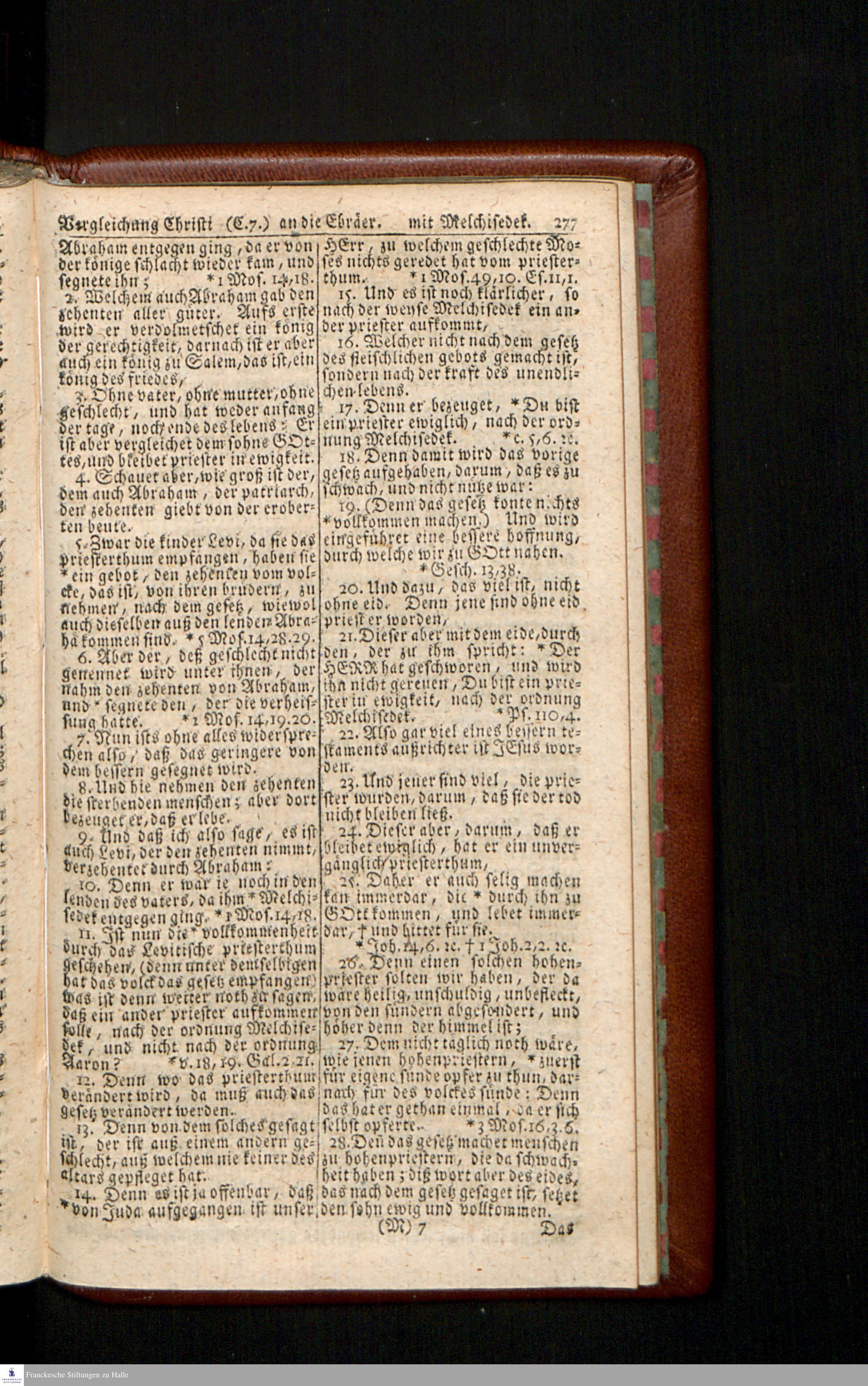 Biblia, Das ist: Die gantze Heil. Schrift Altes und Neues Testaments / Nach der Teutschen Ubersetzung D. Martin Luthers; Mit iedes Capitels kurtzen Summarien/ und nöthigsten Parallelen; Mit Fleiß übersehen, Und gegen einige/ sonderlich erstere/ Editiones des sel. Mannes gehalten, auch an unterschiedlichen Orten nach denselben eingerichtet, und von vielen in den bisherigen Exemplarien hin und wieder eingeschlichenen druckfehlern gesaubert. Nebst einer Vorrede Hn. Baron Carl Hildebrands v. Canstein.