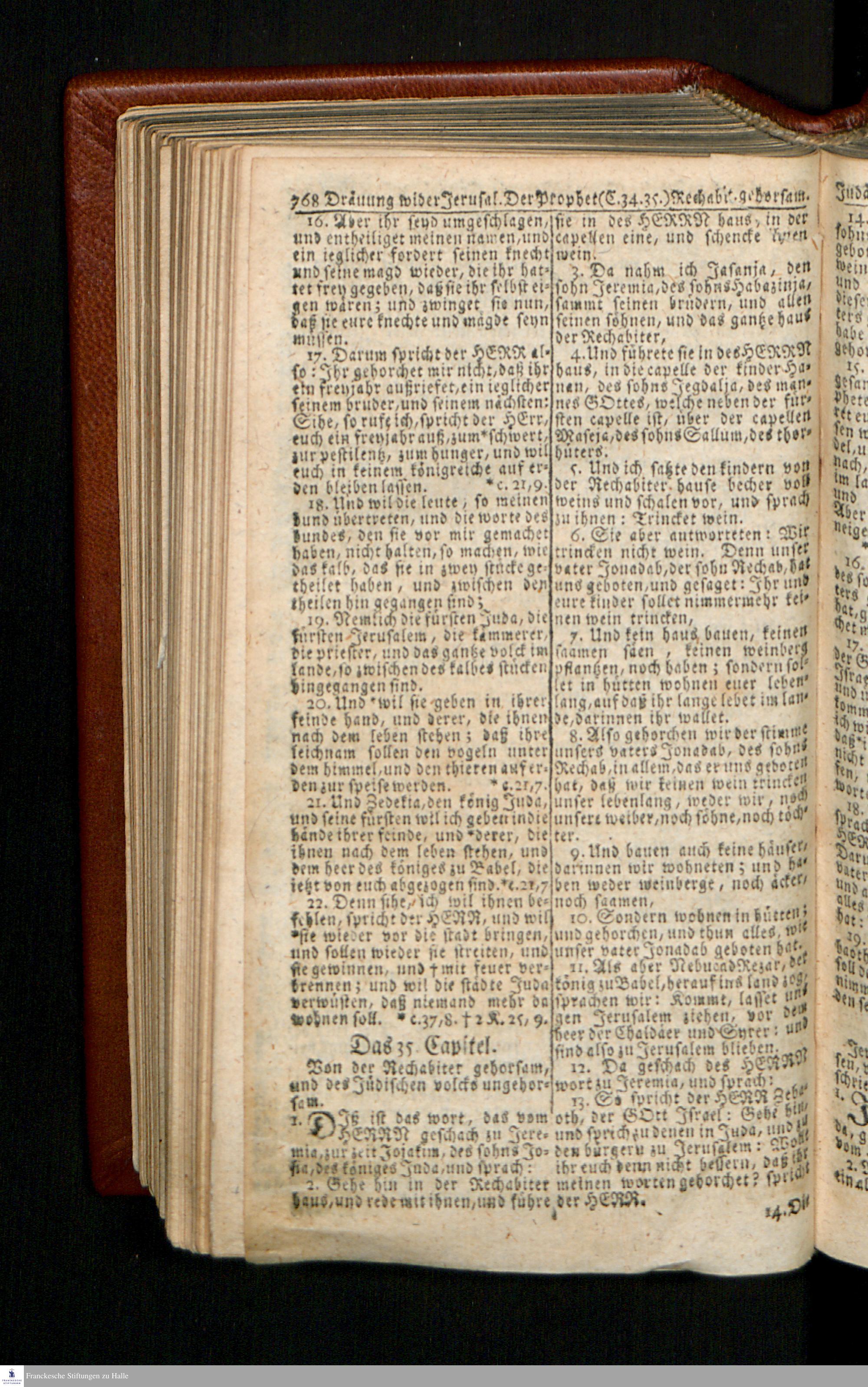Biblia, Das ist: Die gantze Heil. Schrift Altes und Neues Testaments / Nach der Teutschen Ubersetzung D. Martin Luthers; Mit iedes Capitels kurtzen Summarien/ und nöthigsten Parallelen; Mit Fleiß übersehen, Und gegen einige/ sonderlich erstere/ Editiones des sel. Mannes gehalten, auch an unterschiedlichen Orten nach denselben eingerichtet, und von vielen in den bisherigen Exemplarien hin und wieder eingeschlichenen druckfehlern gesaubert. Nebst einer Vorrede Hn. Baron Carl Hildebrands v. Canstein.