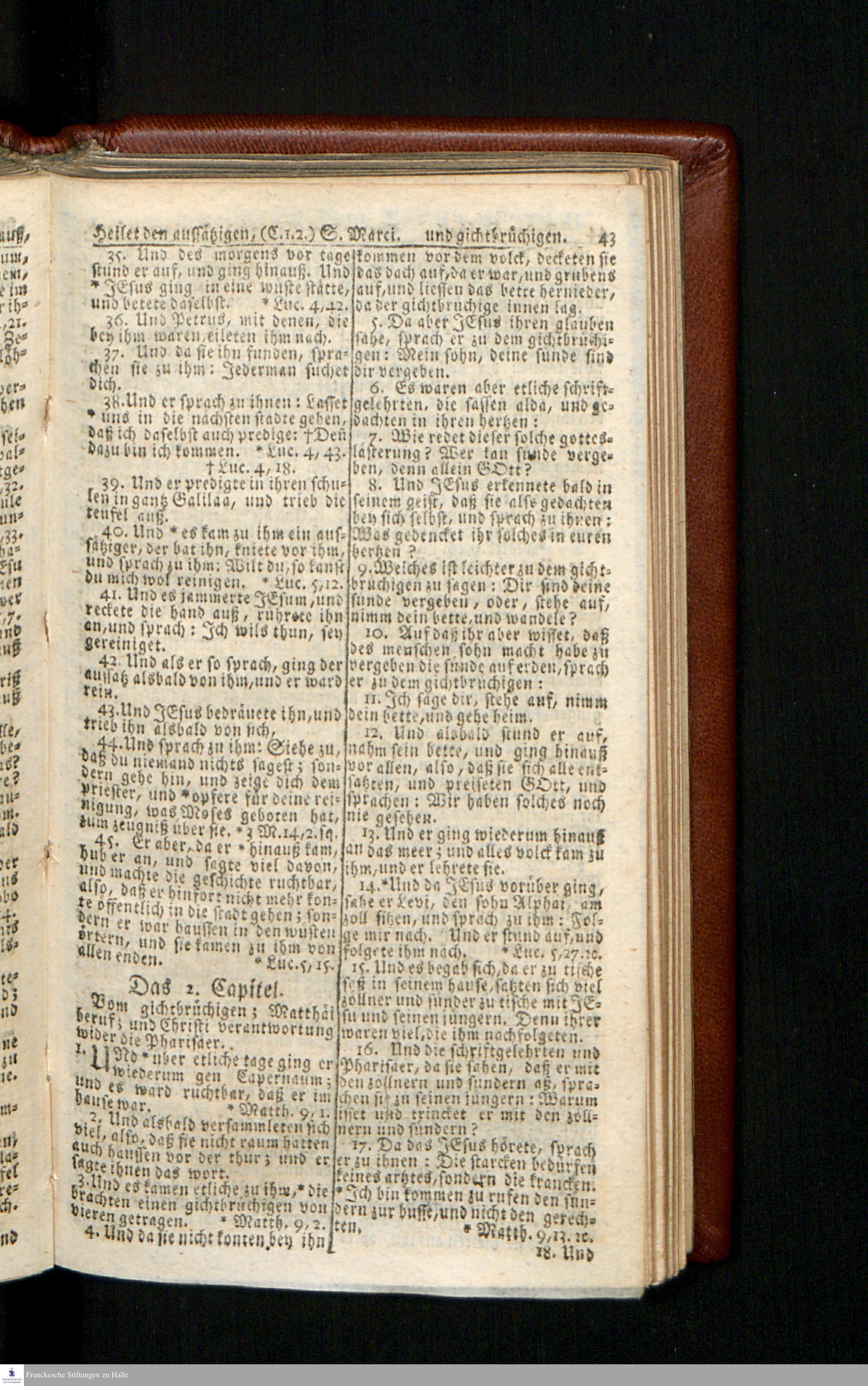Biblia, Das ist: Die gantze Heil. Schrift Altes und Neues Testaments / Nach der Teutschen Ubersetzung D. Martin Luthers; Mit iedes Capitels kurtzen Summarien/ und nöthigsten Parallelen; Mit Fleiß übersehen, Und gegen einige/ sonderlich erstere/ Editiones des sel. Mannes gehalten, auch an unterschiedlichen Orten nach denselben eingerichtet, und von vielen in den bisherigen Exemplarien hin und wieder eingeschlichenen druckfehlern gesaubert. Nebst einer Vorrede Hn. Baron Carl Hildebrands v. Canstein.