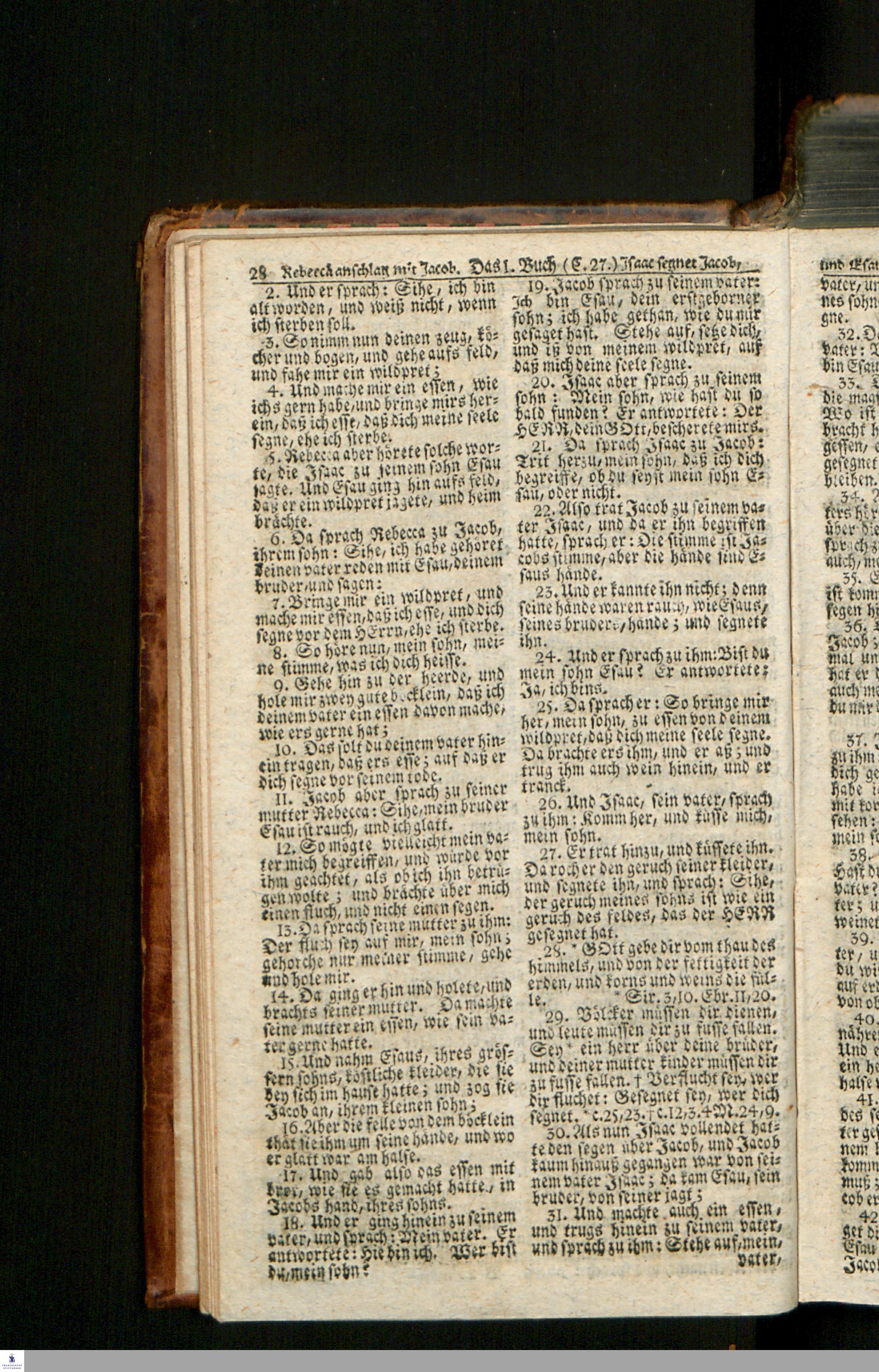 Biblia, Das ist: Die gantze Heil. Schrift Altes und Neues Testaments / Nach der Teutschen Ubersetzung D. Martin Luthers; Mit iedes Capitels kurtzen Summarien/ und nöthigsten Parallelen; Mit Fleiß übersehen, Und gegen einige/ sonderlich erstere/ Editiones des sel. Mannes gehalten, auch an unterschiedlichen Orten nach denselben eingerichtet, und von vielen in den bisherigen Exemplarien hin und wieder eingeschlichenen druckfehlern gesaubert. Nebst einer Vorrede Hn. Baron Carl Hildebrands v. Canstein.