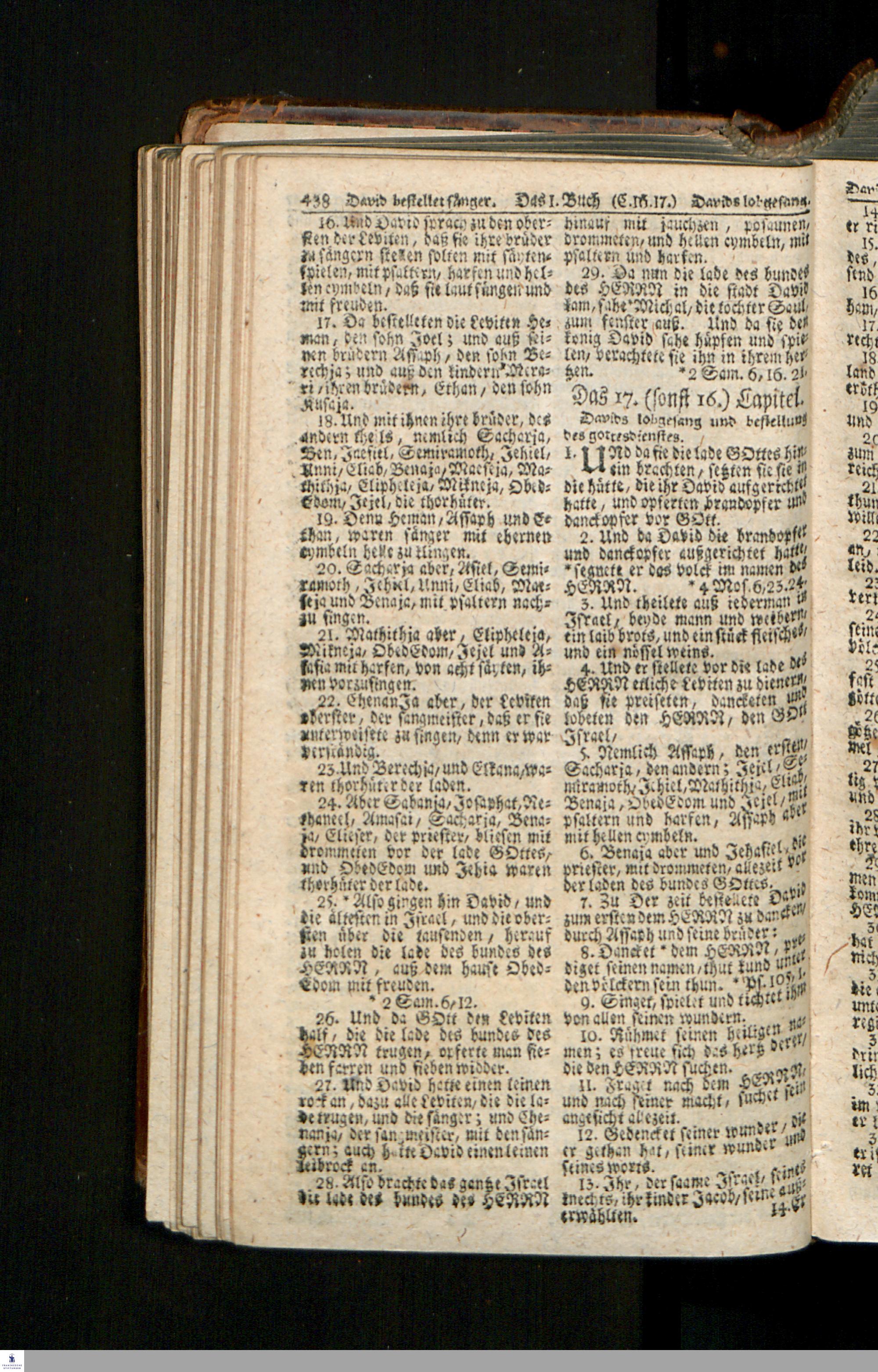 Biblia, Das ist: Die gantze Heil. Schrift Altes und Neues Testaments / Nach der Teutschen Ubersetzung D. Martin Luthers; Mit iedes Capitels kurtzen Summarien/ und nöthigsten Parallelen; Mit Fleiß übersehen, Und gegen einige/ sonderlich erstere/ Editiones des sel. Mannes gehalten, auch an unterschiedlichen Orten nach denselben eingerichtet, und von vielen in den bisherigen Exemplarien hin und wieder eingeschlichenen druckfehlern gesaubert. Nebst einer Vorrede Hn. Baron Carl Hildebrands v. Canstein.