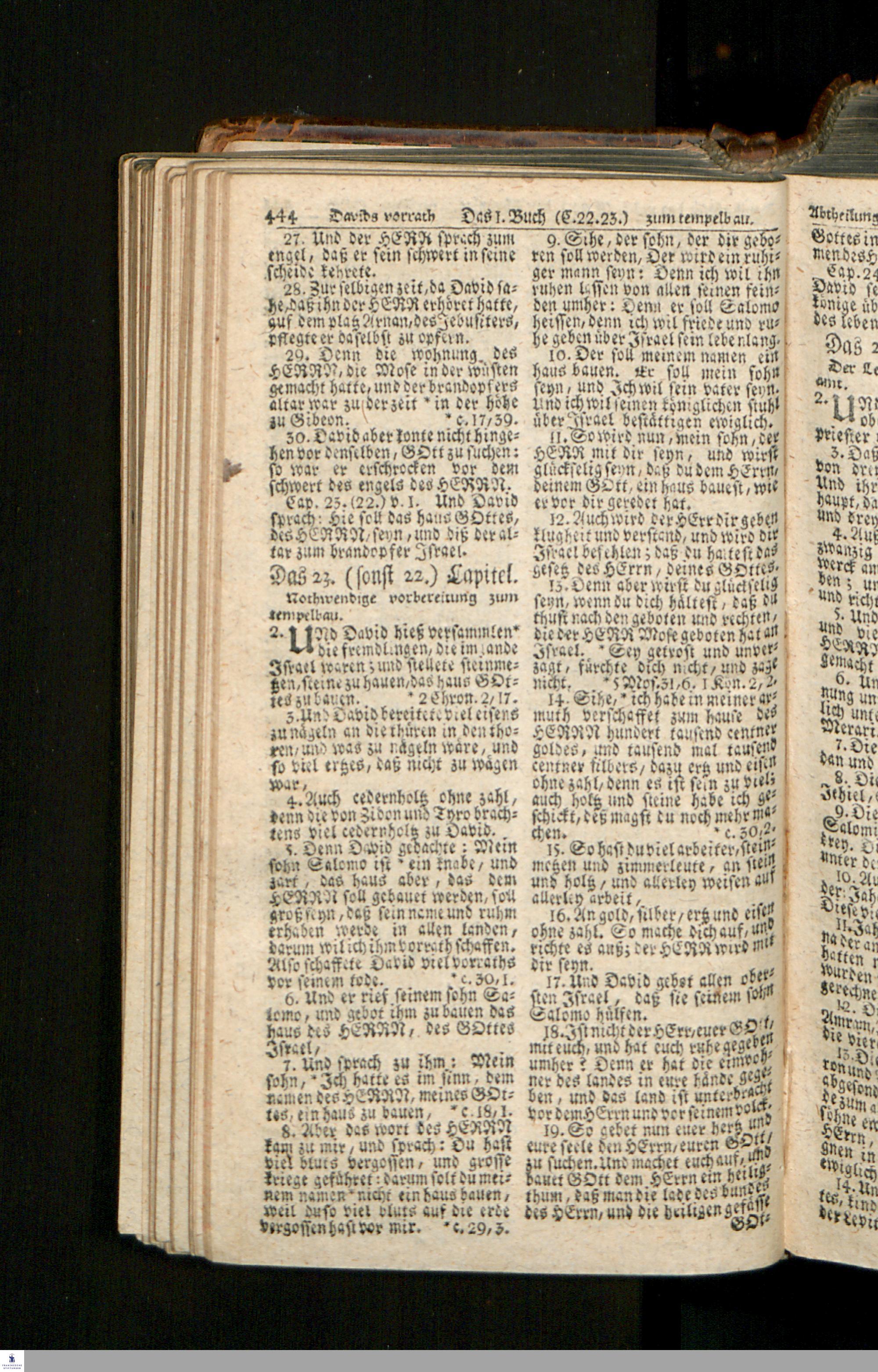 Biblia, Das ist: Die gantze Heil. Schrift Altes und Neues Testaments / Nach der Teutschen Ubersetzung D. Martin Luthers; Mit iedes Capitels kurtzen Summarien/ und nöthigsten Parallelen; Mit Fleiß übersehen, Und gegen einige/ sonderlich erstere/ Editiones des sel. Mannes gehalten, auch an unterschiedlichen Orten nach denselben eingerichtet, und von vielen in den bisherigen Exemplarien hin und wieder eingeschlichenen druckfehlern gesaubert. Nebst einer Vorrede Hn. Baron Carl Hildebrands v. Canstein.