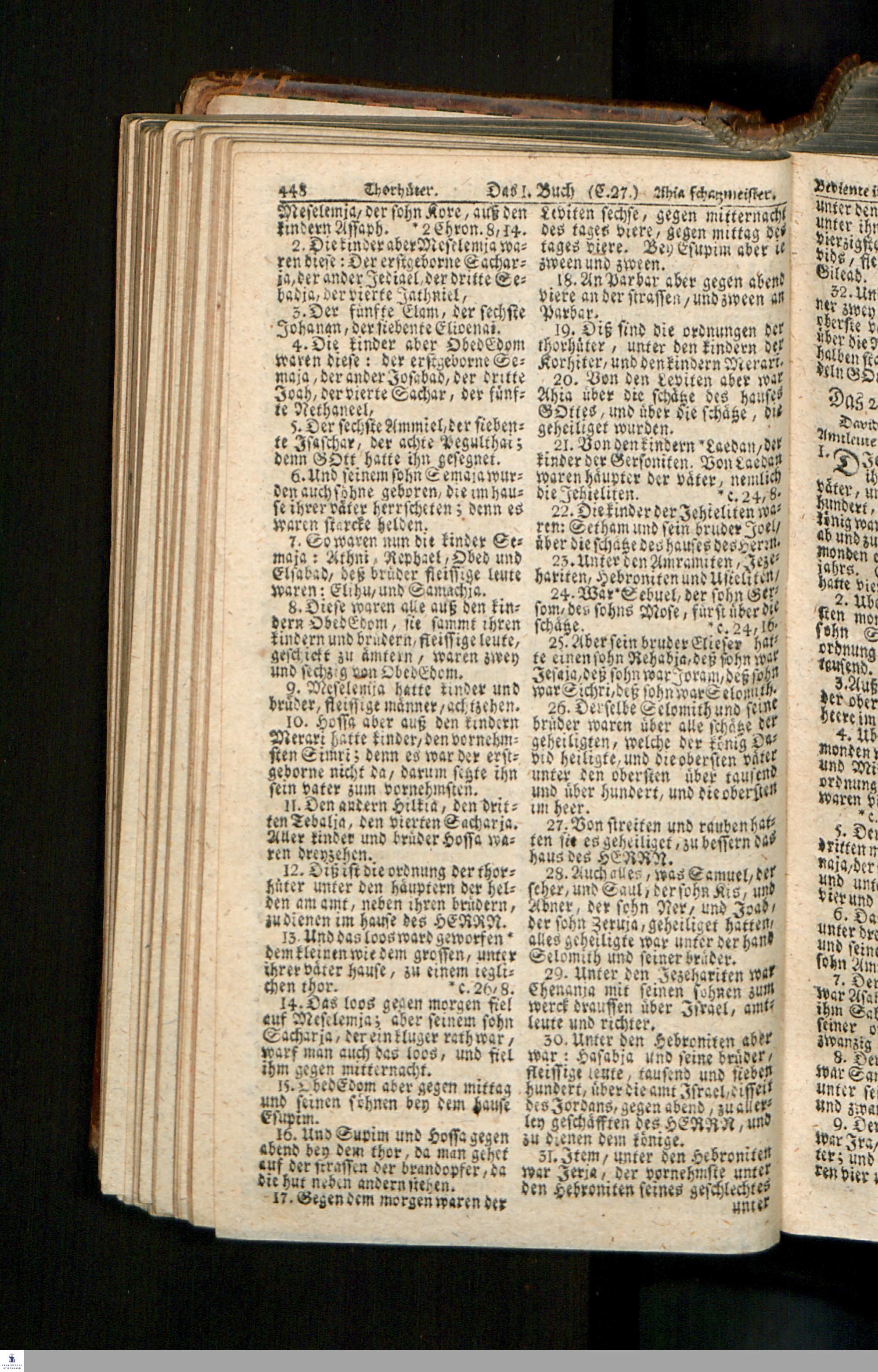 Biblia, Das ist: Die gantze Heil. Schrift Altes und Neues Testaments / Nach der Teutschen Ubersetzung D. Martin Luthers; Mit iedes Capitels kurtzen Summarien/ und nöthigsten Parallelen; Mit Fleiß übersehen, Und gegen einige/ sonderlich erstere/ Editiones des sel. Mannes gehalten, auch an unterschiedlichen Orten nach denselben eingerichtet, und von vielen in den bisherigen Exemplarien hin und wieder eingeschlichenen druckfehlern gesaubert. Nebst einer Vorrede Hn. Baron Carl Hildebrands v. Canstein.