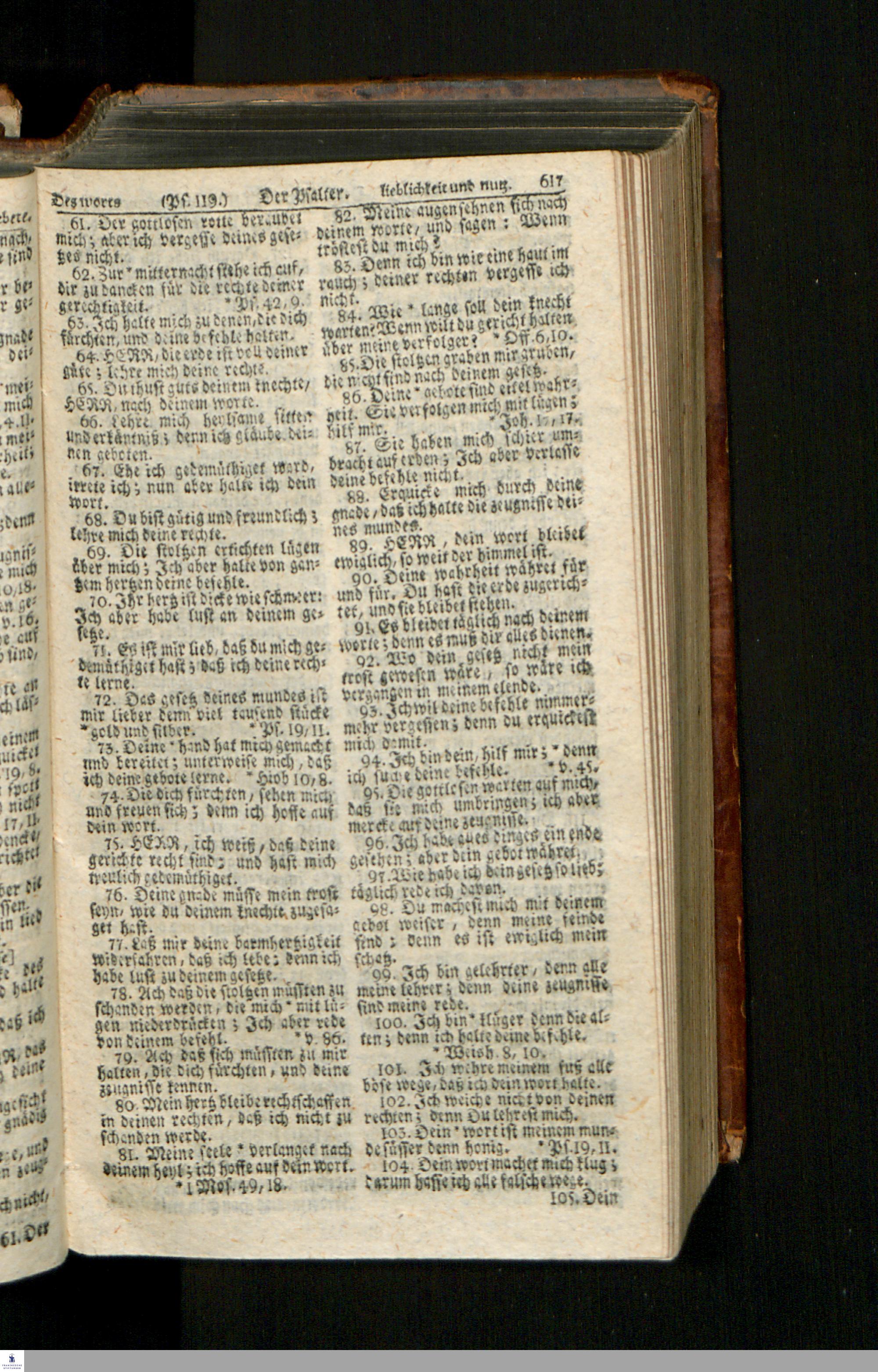 Biblia, Das ist: Die gantze Heil. Schrift Altes und Neues Testaments / Nach der Teutschen Ubersetzung D. Martin Luthers; Mit iedes Capitels kurtzen Summarien/ und nöthigsten Parallelen; Mit Fleiß übersehen, Und gegen einige/ sonderlich erstere/ Editiones des sel. Mannes gehalten, auch an unterschiedlichen Orten nach denselben eingerichtet, und von vielen in den bisherigen Exemplarien hin und wieder eingeschlichenen druckfehlern gesaubert. Nebst einer Vorrede Hn. Baron Carl Hildebrands v. Canstein.