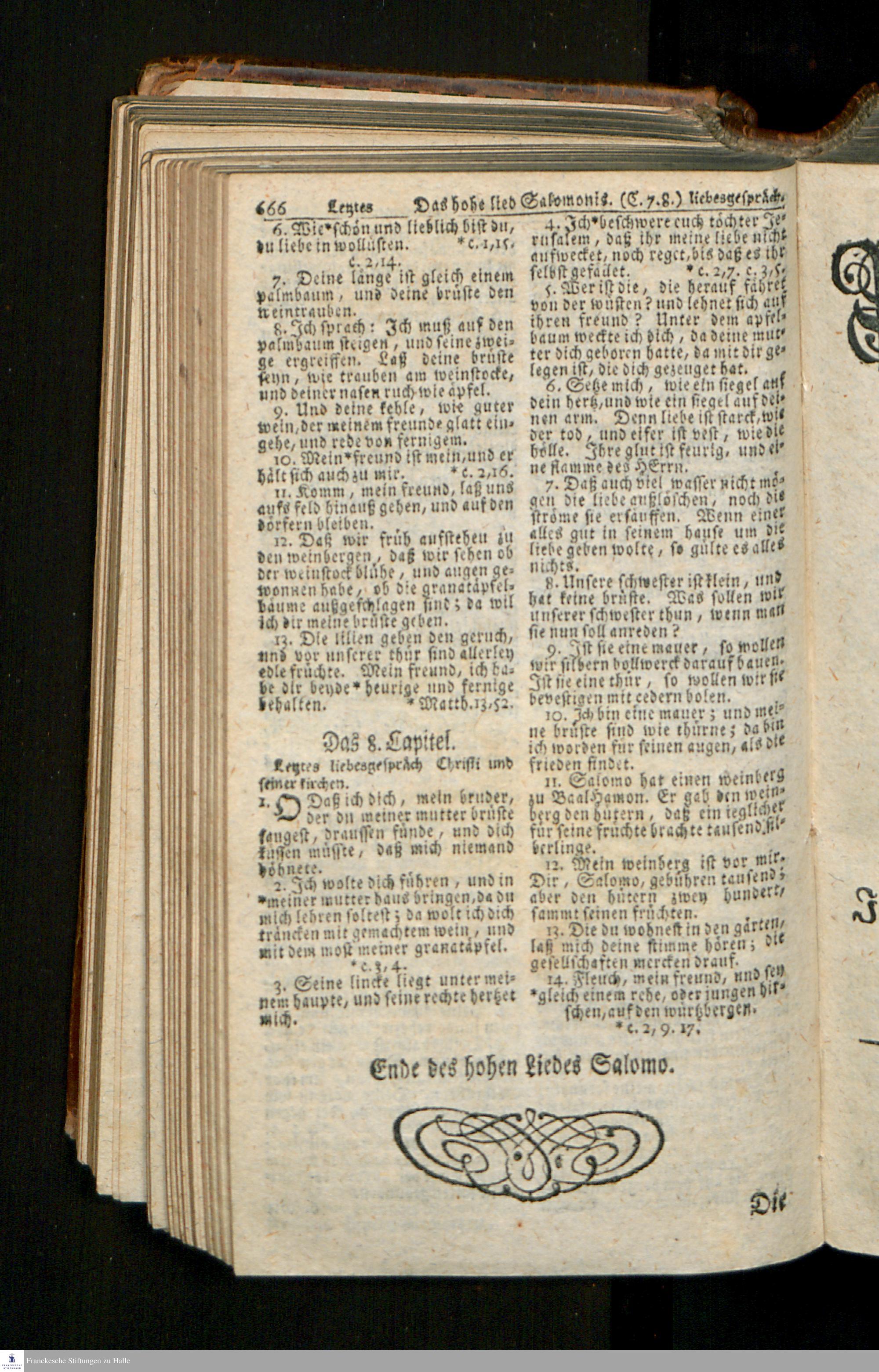 Biblia, Das ist: Die gantze Heil. Schrift Altes und Neues Testaments / Nach der Teutschen Ubersetzung D. Martin Luthers; Mit iedes Capitels kurtzen Summarien/ und nöthigsten Parallelen; Mit Fleiß übersehen, Und gegen einige/ sonderlich erstere/ Editiones des sel. Mannes gehalten, auch an unterschiedlichen Orten nach denselben eingerichtet, und von vielen in den bisherigen Exemplarien hin und wieder eingeschlichenen druckfehlern gesaubert. Nebst einer Vorrede Hn. Baron Carl Hildebrands v. Canstein.