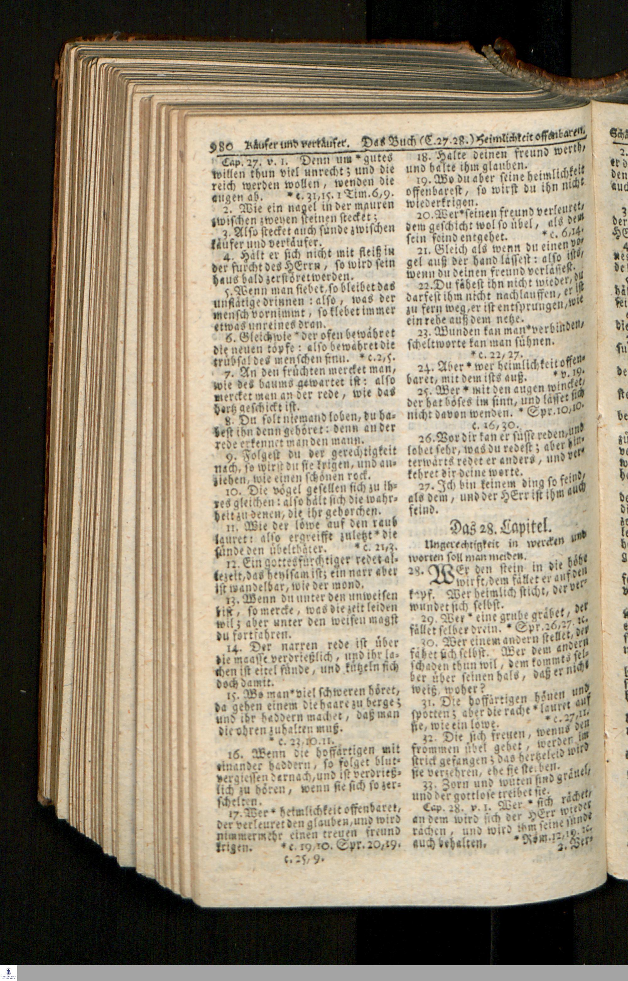 Biblia, Das ist: Die gantze Heil. Schrift Altes und Neues Testaments / Nach der Teutschen Ubersetzung D. Martin Luthers; Mit iedes Capitels kurtzen Summarien/ und nöthigsten Parallelen; Mit Fleiß übersehen, Und gegen einige/ sonderlich erstere/ Editiones des sel. Mannes gehalten, auch an unterschiedlichen Orten nach denselben eingerichtet, und von vielen in den bisherigen Exemplarien hin und wieder eingeschlichenen druckfehlern gesaubert. Nebst einer Vorrede Hn. Baron Carl Hildebrands v. Canstein.