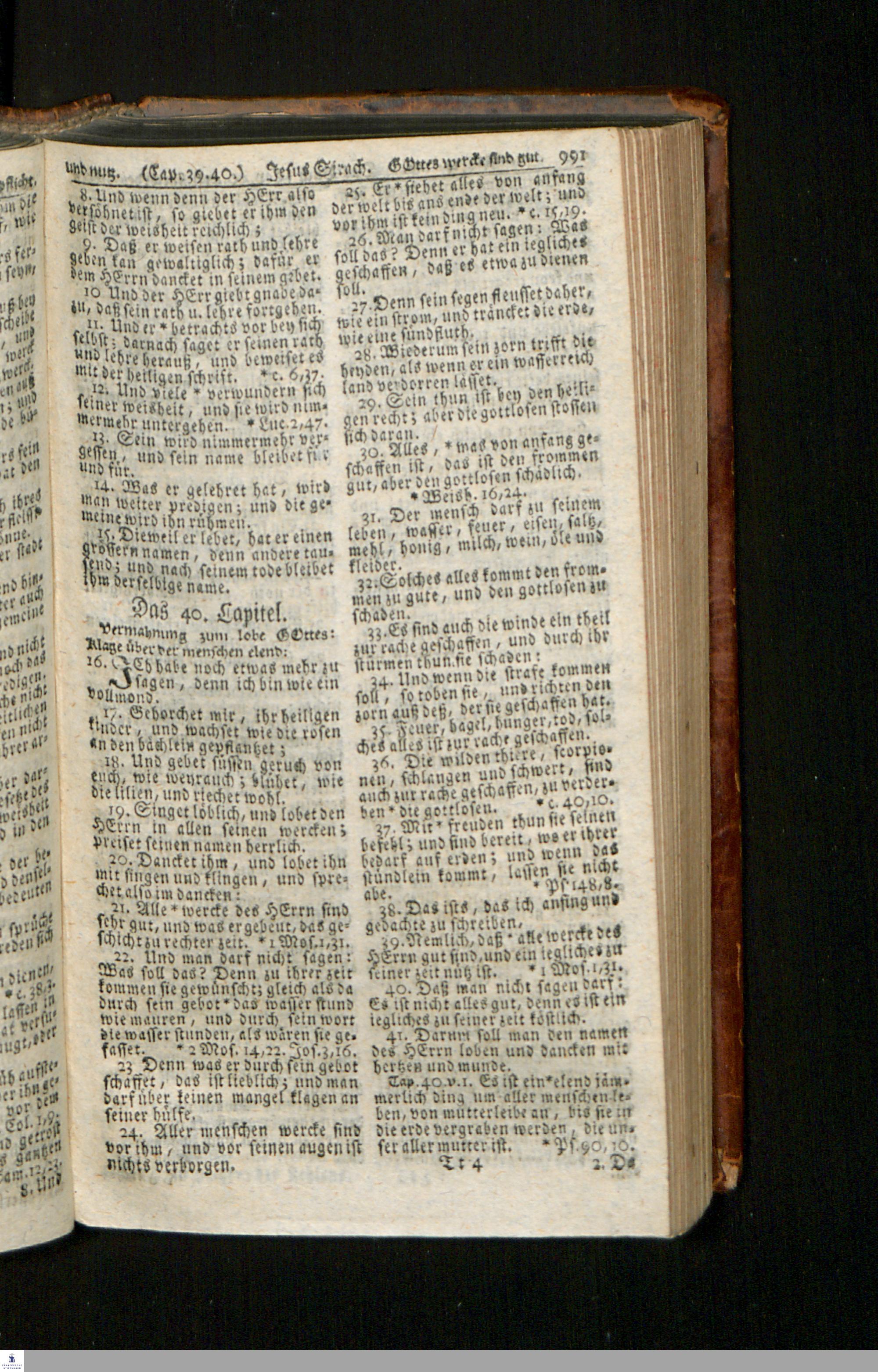 Biblia, Das ist: Die gantze Heil. Schrift Altes und Neues Testaments / Nach der Teutschen Ubersetzung D. Martin Luthers; Mit iedes Capitels kurtzen Summarien/ und nöthigsten Parallelen; Mit Fleiß übersehen, Und gegen einige/ sonderlich erstere/ Editiones des sel. Mannes gehalten, auch an unterschiedlichen Orten nach denselben eingerichtet, und von vielen in den bisherigen Exemplarien hin und wieder eingeschlichenen druckfehlern gesaubert. Nebst einer Vorrede Hn. Baron Carl Hildebrands v. Canstein.
