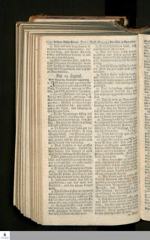 Biblia, Das ist: Die gantze Heil. Schrift Altes und Neues Testaments / Nach der Teutschen Ubersetzung D. Martin Luthers; Mit iedes Capitels kurtzen Summarien/ und nöthigsten Parallelen; Mit Fleiß übersehen, Und gegen einige/ sonderlich erstere/ Editiones des sel. Mannes gehalten, auch an unterschiedlichen Orten nach denselben eingerichtet, und von vielen in den bisherigen Exemplarien hin und wieder eingeschlichenen druckfehlern gesaubert. Nebst einer Vorrede Hn. Baron Carl Hildebrands v. Canstein.