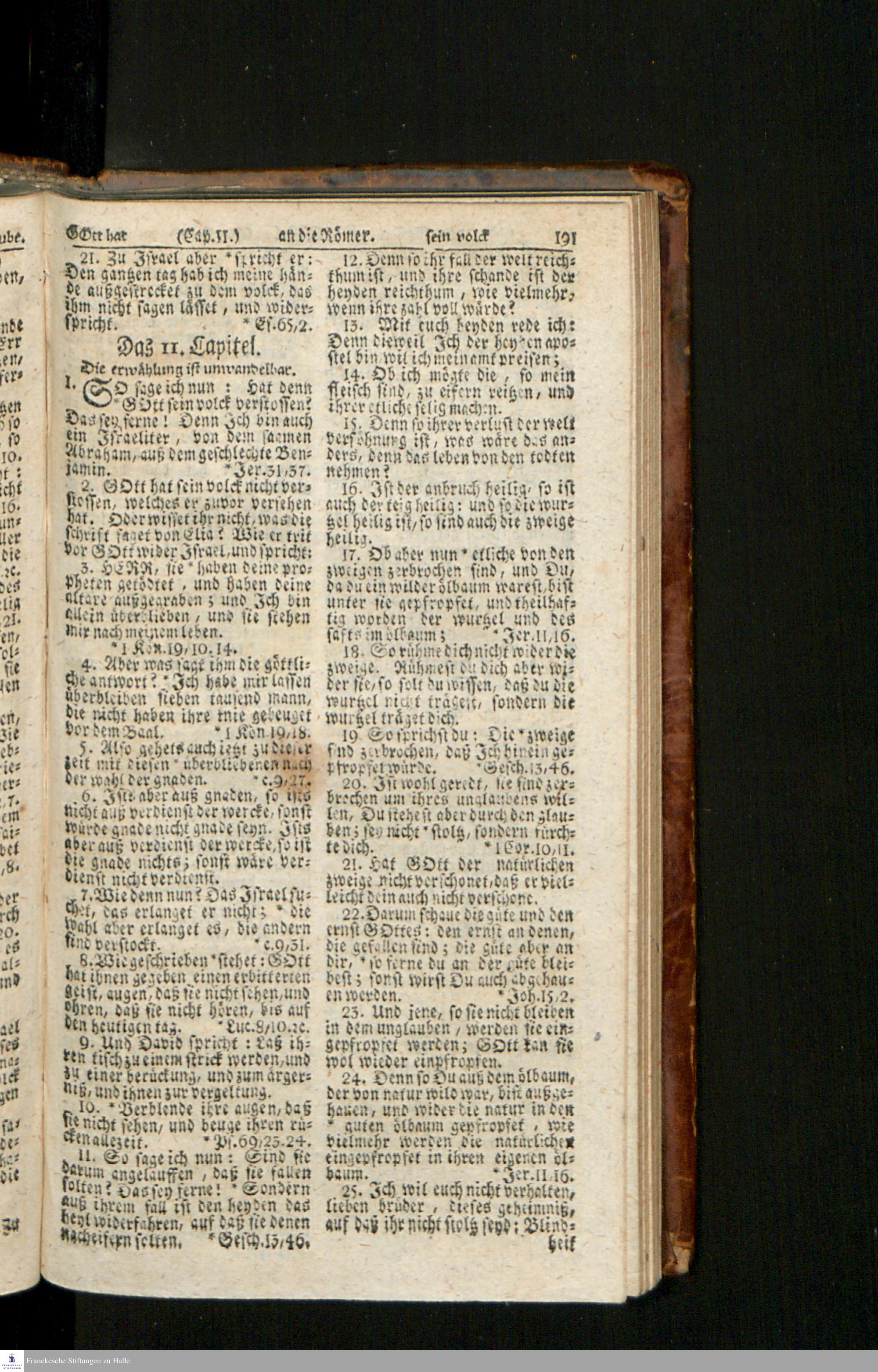 Biblia, Das ist: Die gantze Heil. Schrift Altes und Neues Testaments / Nach der Teutschen Ubersetzung D. Martin Luthers; Mit iedes Capitels kurtzen Summarien/ und nöthigsten Parallelen; Mit Fleiß übersehen, Und gegen einige/ sonderlich erstere/ Editiones des sel. Mannes gehalten, auch an unterschiedlichen Orten nach denselben eingerichtet, und von vielen in den bisherigen Exemplarien hin und wieder eingeschlichenen druckfehlern gesaubert. Nebst einer Vorrede Hn. Baron Carl Hildebrands v. Canstein.