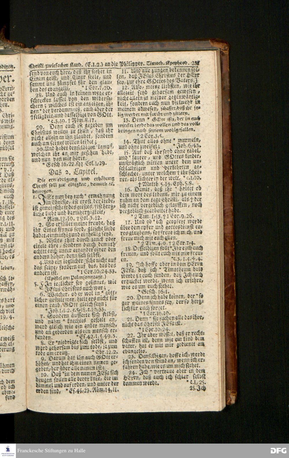 Biblia, Das ist: Die gantze Heil. Schrift Altes und Neues Testaments / Nach der Teutschen Ubersetzung D. Martin Luthers; Mit iedes Capitels kurtzen Summarien/ und nöthigsten Parallelen; Mit Fleiß übersehen, Und gegen einige/ sonderlich erstere/ Editiones des sel. Mannes gehalten, auch an unterschiedlichen Orten nach denselben eingerichtet, und von vielen in den bisherigen Exemplarien hin und wieder eingeschlichenen druckfehlern gesaubert. Nebst einer Vorrede Hn. Baron Carl Hildebrands v. Canstein.