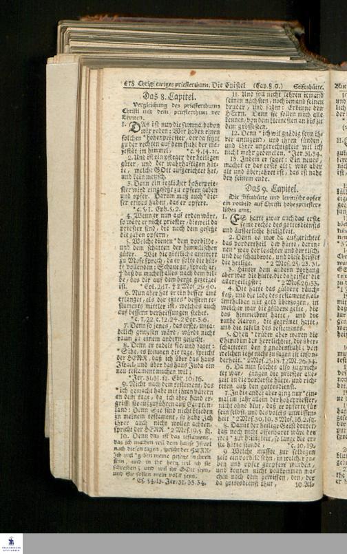 Biblia, Das ist: Die gantze Heil. Schrift Altes und Neues Testaments / Nach der Teutschen Ubersetzung D. Martin Luthers; Mit iedes Capitels kurtzen Summarien/ und nöthigsten Parallelen; Mit Fleiß übersehen, Und gegen einige/ sonderlich erstere/ Editiones des sel. Mannes gehalten, auch an unterschiedlichen Orten nach denselben eingerichtet, und von vielen in den bisherigen Exemplarien hin und wieder eingeschlichenen druckfehlern gesaubert. Nebst einer Vorrede Hn. Baron Carl Hildebrands v. Canstein.