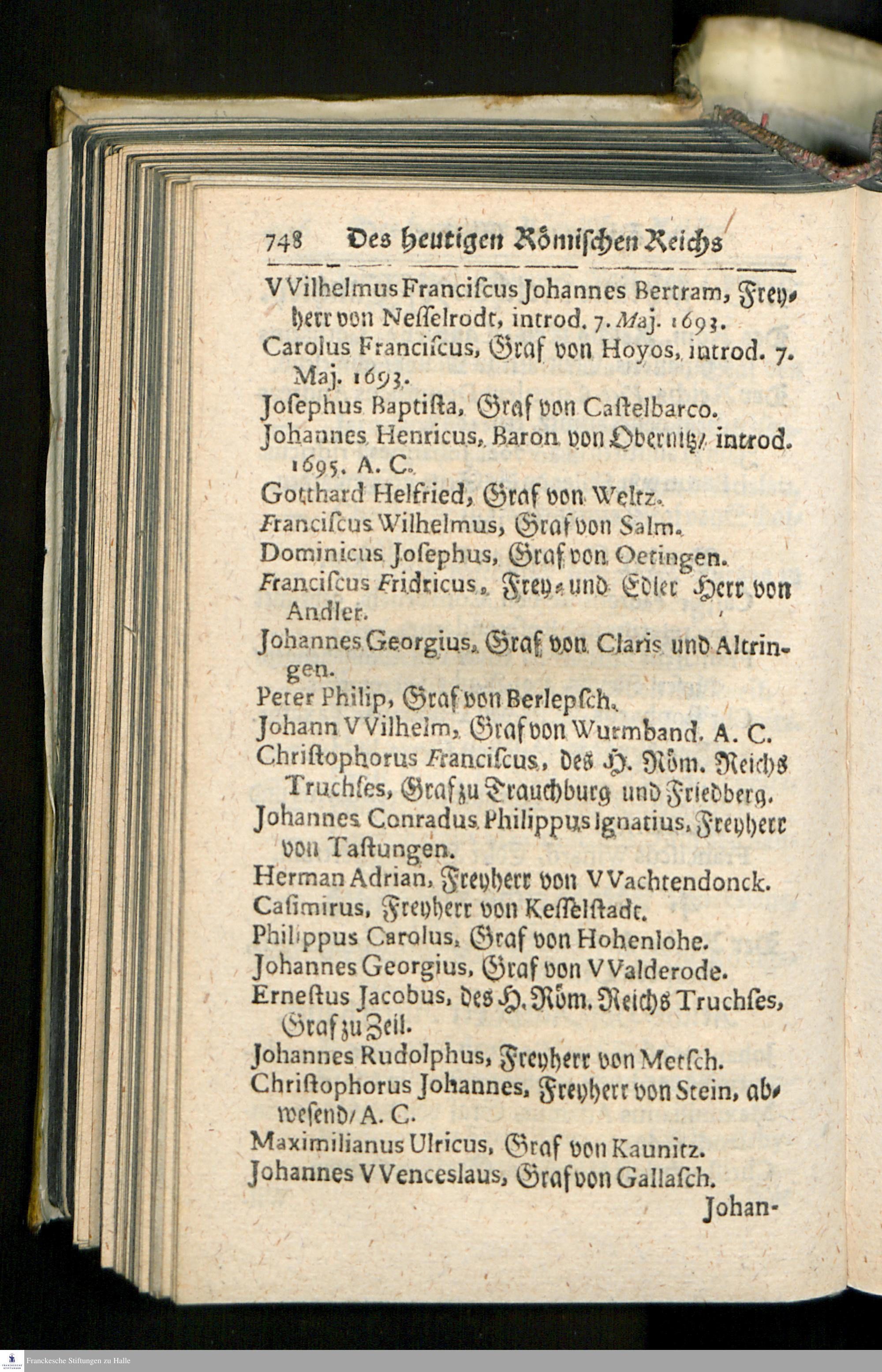 Die heutigen Christlichen Souverainen Von Europa, Das ist: Ein kurtzer Genealogischer und Politischer Abriß/ : Darinnen des Heil. Röm. Reiches/ aller Königreiche/ Staaten und Souverainen Fürsten von Europa Historische Haupt-Periodi, ... : Nebst ieden Landes angehengten berühmten Familien, Ritter-Orden/ Societeten und hin und wieder subsistirenden Gesandten/ nach Geographischer Ordnung vorgestellet worden/ ...