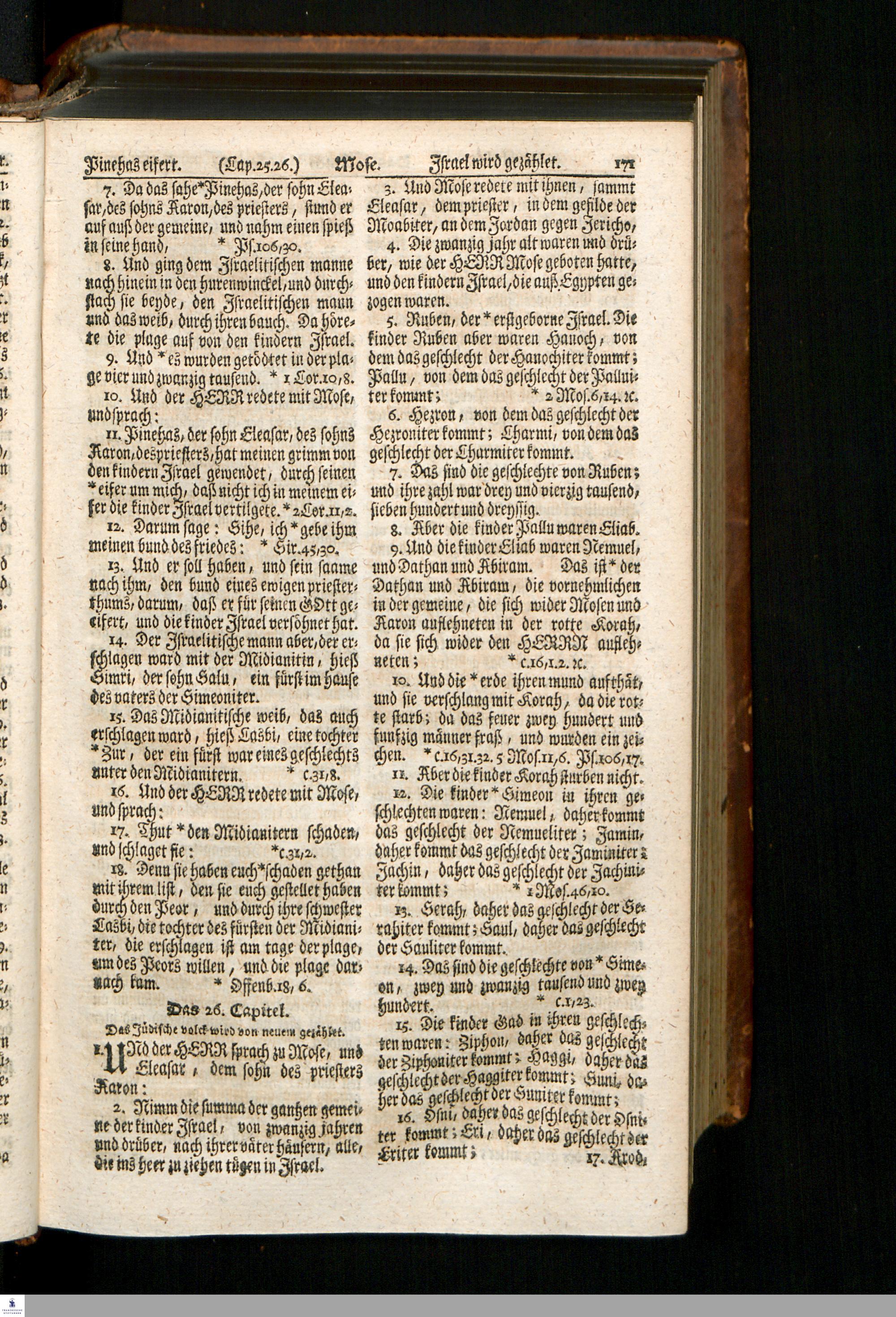 Biblia, Das ist: Die gantze Heil. Schrift Altes und Neues Testaments / Nach der Teutschen Ubersetzung D. Martin Luthers; Mit iedes Capitels kurtzen Summarien, auch beygefügten vielen und richtigen Parallelen; Mit fleiß übersehen/ und gegen einige/ sonderlich erstere/ Editiones des sel. Mannes gehalten, auch an unterschiedlichen Orten nach denselben eingerichtet, und von vielen in den bisherigen Exemplarien hin und wieder eingeschlichenen Fehlern gesaubert. Nebst einer Vorrede Herrn Baron Carl Hildebrands von Canstein