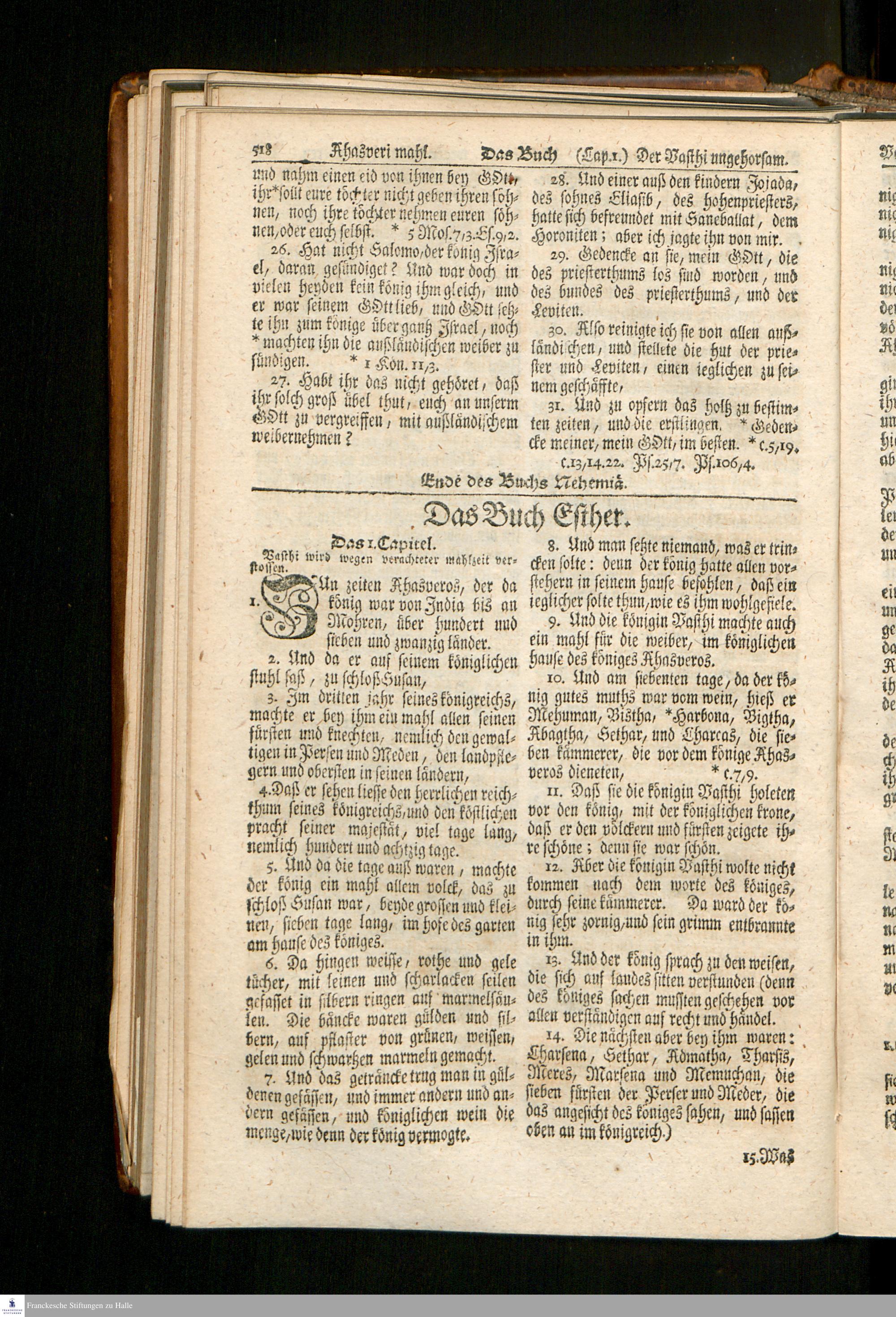 Biblia, Das ist: Die gantze Heil. Schrift Altes und Neues Testaments / Nach der Teutschen Ubersetzung D. Martin Luthers; Mit iedes Capitels kurtzen Summarien, auch beygefügten vielen und richtigen Parallelen; Mit fleiß übersehen/ und gegen einige/ sonderlich erstere/ Editiones des sel. Mannes gehalten, auch an unterschiedlichen Orten nach denselben eingerichtet, und von vielen in den bisherigen Exemplarien hin und wieder eingeschlichenen Fehlern gesaubert. Nebst einer Vorrede Herrn Baron Carl Hildebrands von Canstein